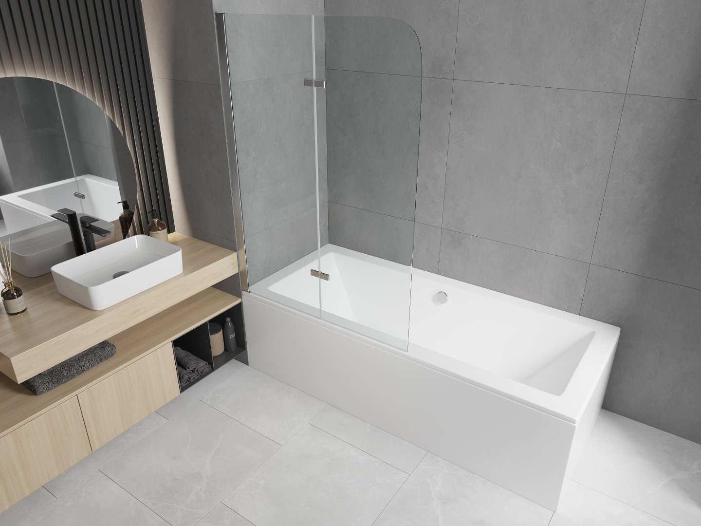 Paravan vyrobený ze dvou křídel s možností složení. Takové řešení umožňuje ušetřit více místa v koupelně a umožňuje volné využití zbývajícího prostoru, když nepoužíváme koupací zónu.