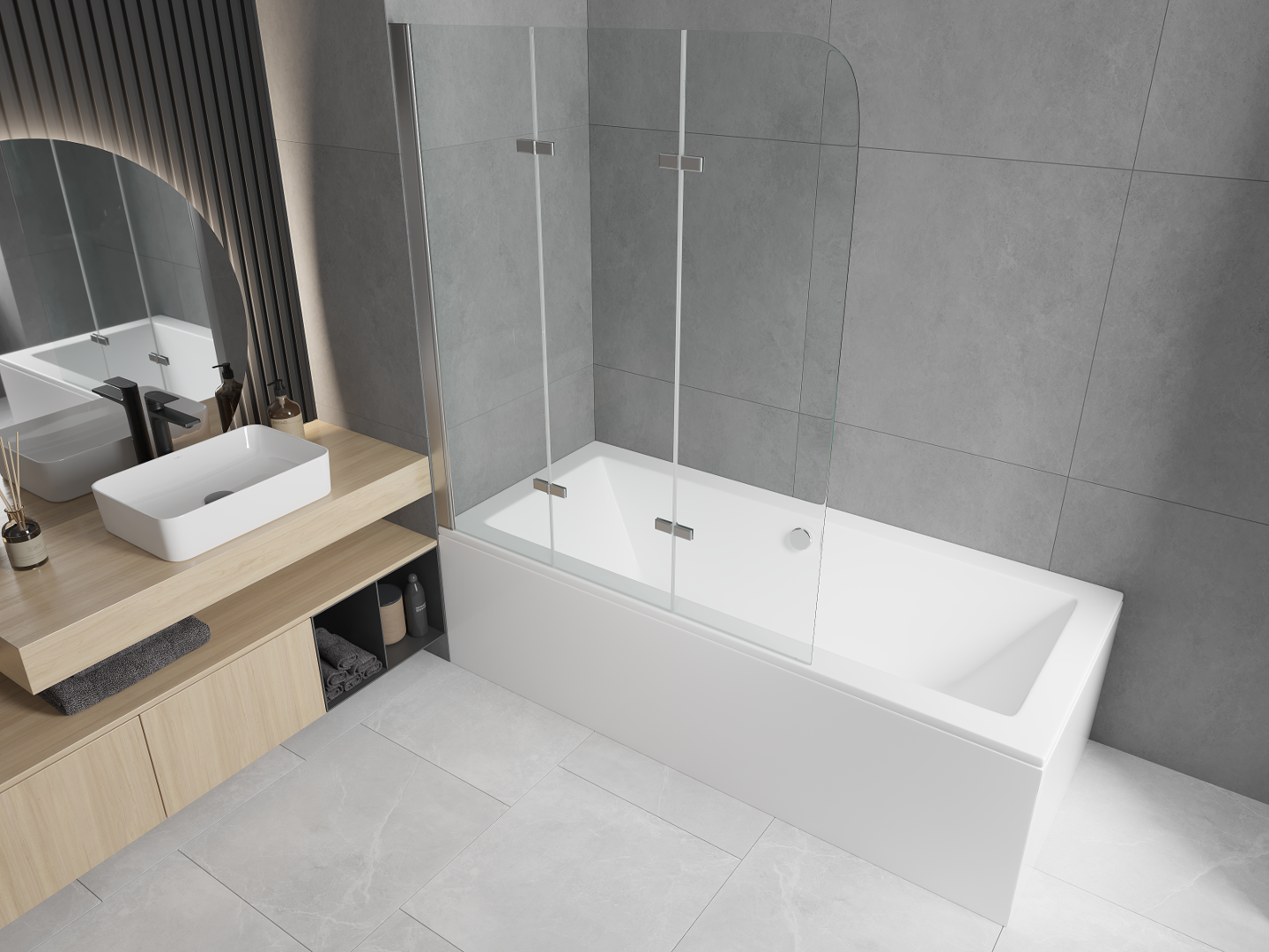 Paravan vyrobený ze tří křídel s možností složení. Takové řešení umožňuje ušetřit více místa v koupelně a umožňuje volné využití zbývajícího prostoru, když nepoužíváme koupací zónu.