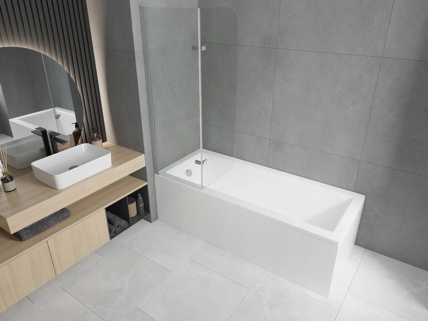 Paravan vyrobený ze dvou křídel s možností složení. Takové řešení umožňuje ušetřit více místa v koupelně a umožňuje volné využití zbývajícího prostoru, když nepoužíváme koupací zónu.