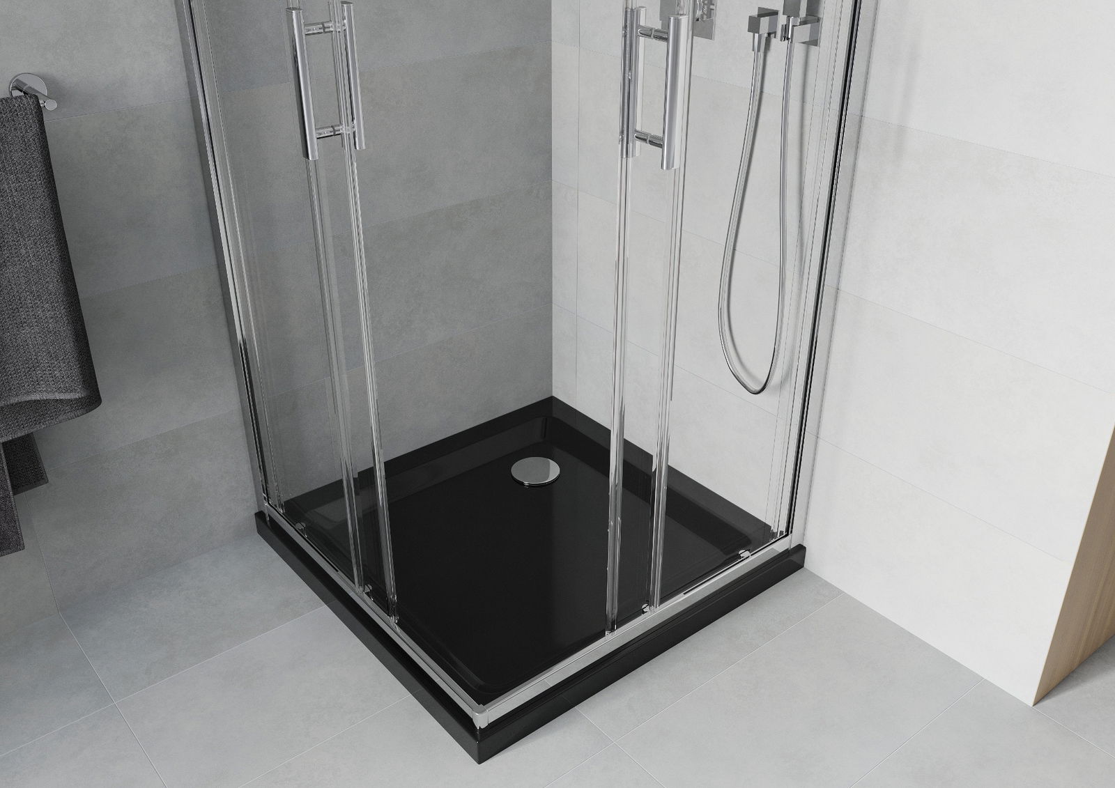 Praktická a pohodlná rukojeť je vyrobena z odolného a trvanlivého kovu. Moderní tvar ve spojení s povrchovou úpravou, která ladí s barvou profilů, dodává celku moderní a stylový vzhled, zdůrazňující estetiku každé koupelny.