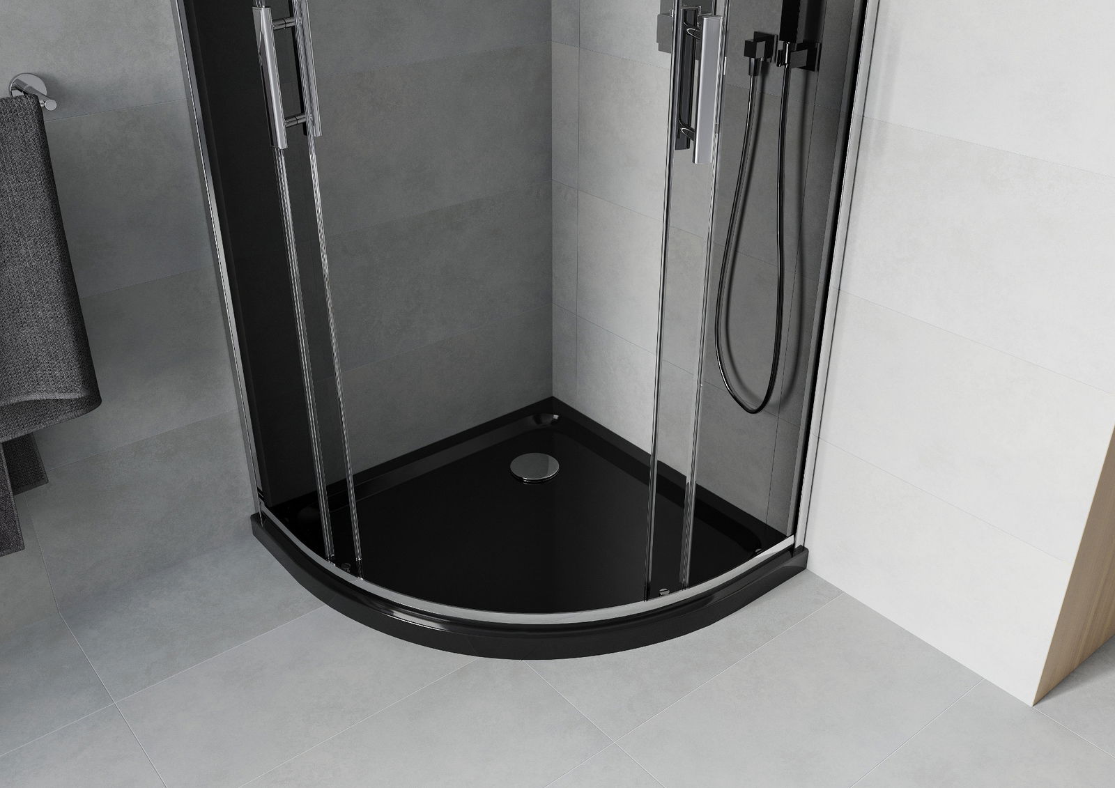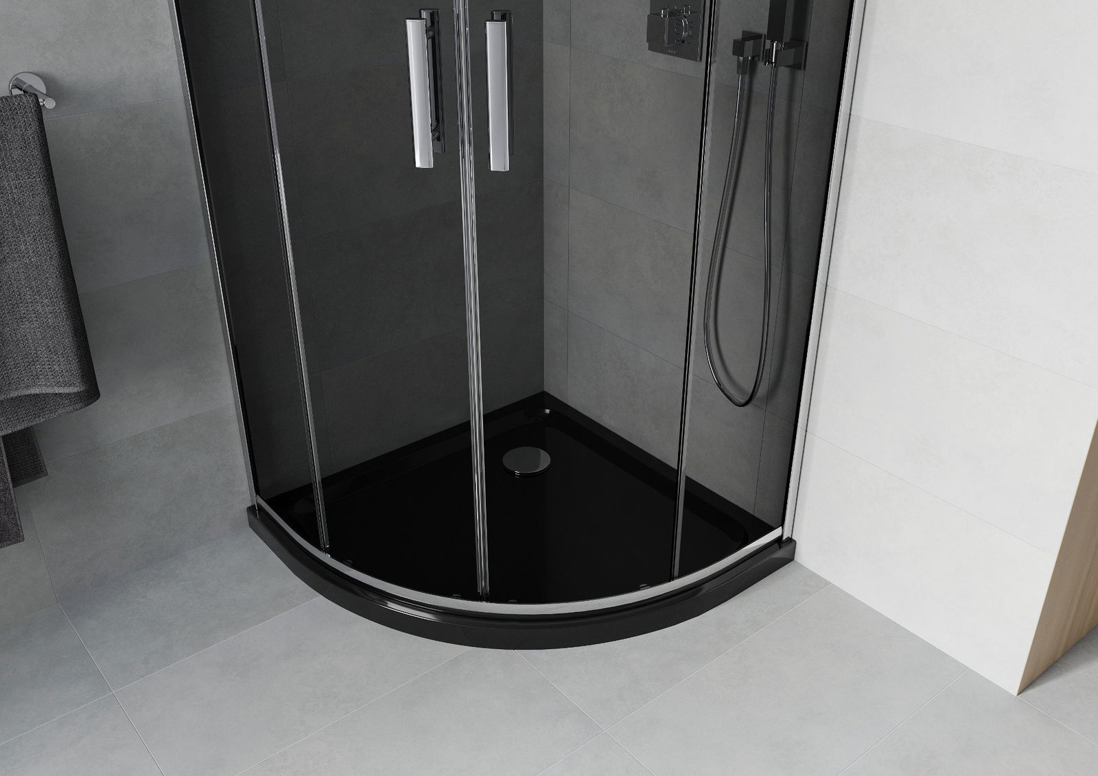 Praktická a pohodlná rukojeť je vyrobena z odolného a trvanlivého kovu. Moderní tvar ve spojení s povrchovou úpravou, která ladí s barvou profilů, dodává celku moderní a stylový vzhled, zdůrazňující estetiku každé koupelny.