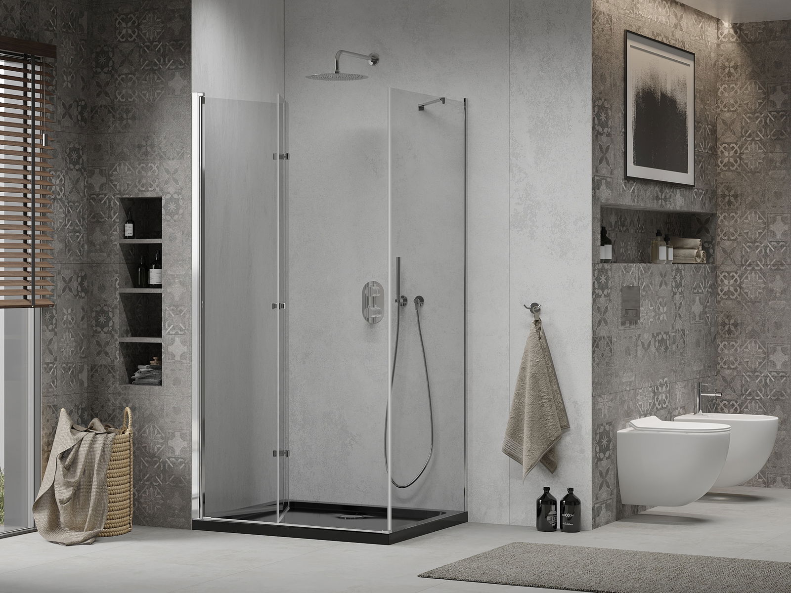 Možnost skládání dveří, jak dovnitř, tak ven, umožňuje získat více prostoru při nepoužívání sprchy. Je to ideální řešení pro menší koupelny, maximálně využívající dostupný prostor.