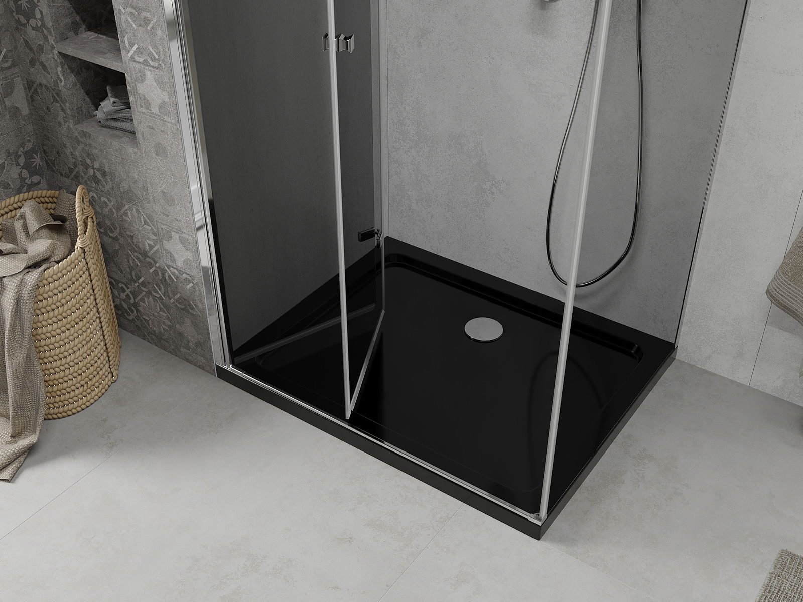 Možnost skládání dveří, jak dovnitř, tak ven, umožňuje získat více prostoru při nepoužívání sprchy. Je to ideální řešení pro menší koupelny, maximálně využívající dostupný prostor.
