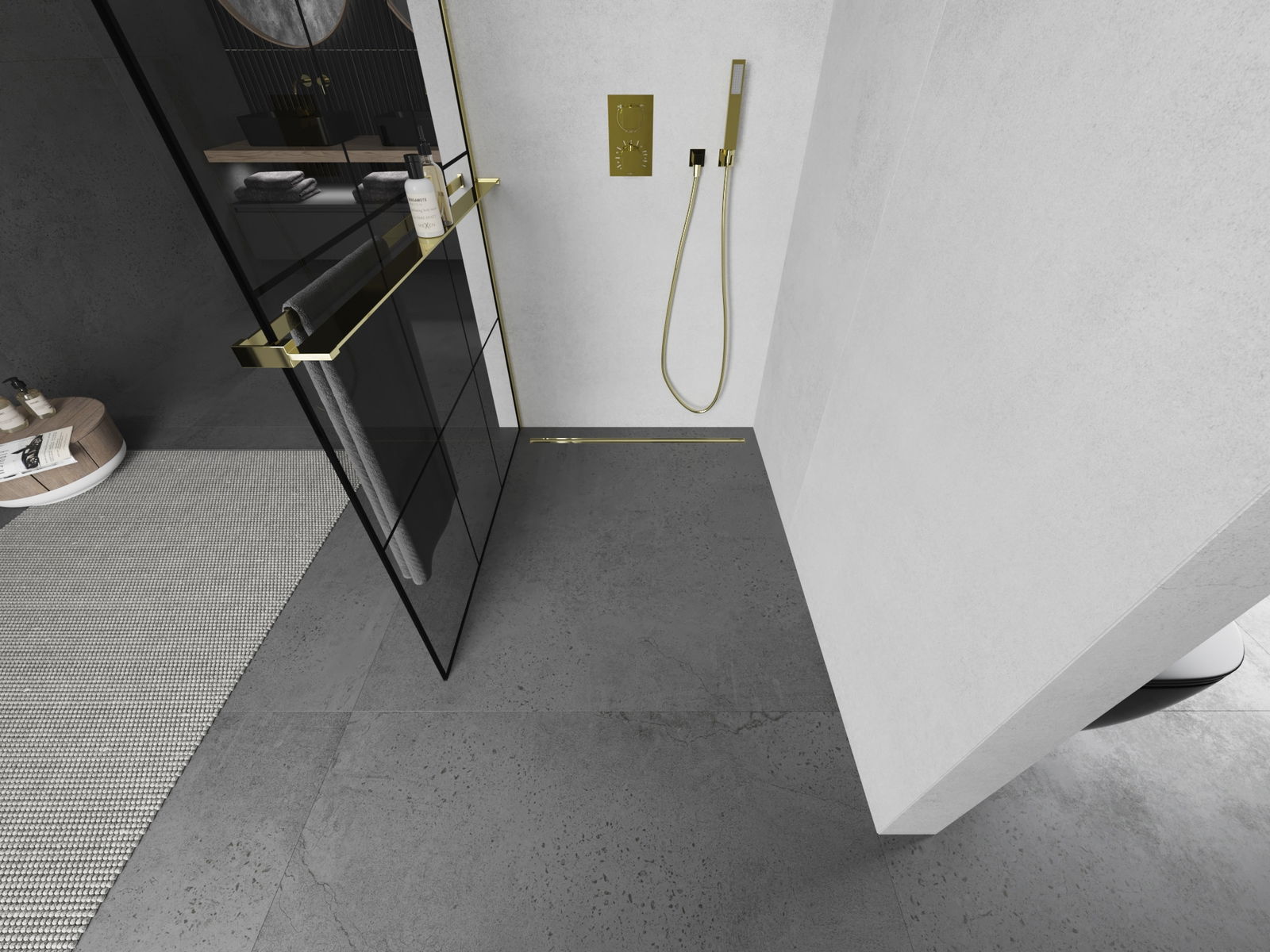Mexen Kioto+ sprchová stěna s policí Walk-in 120 x 200 cm, černá mřížka, zlatá - 800-120-121-50-77