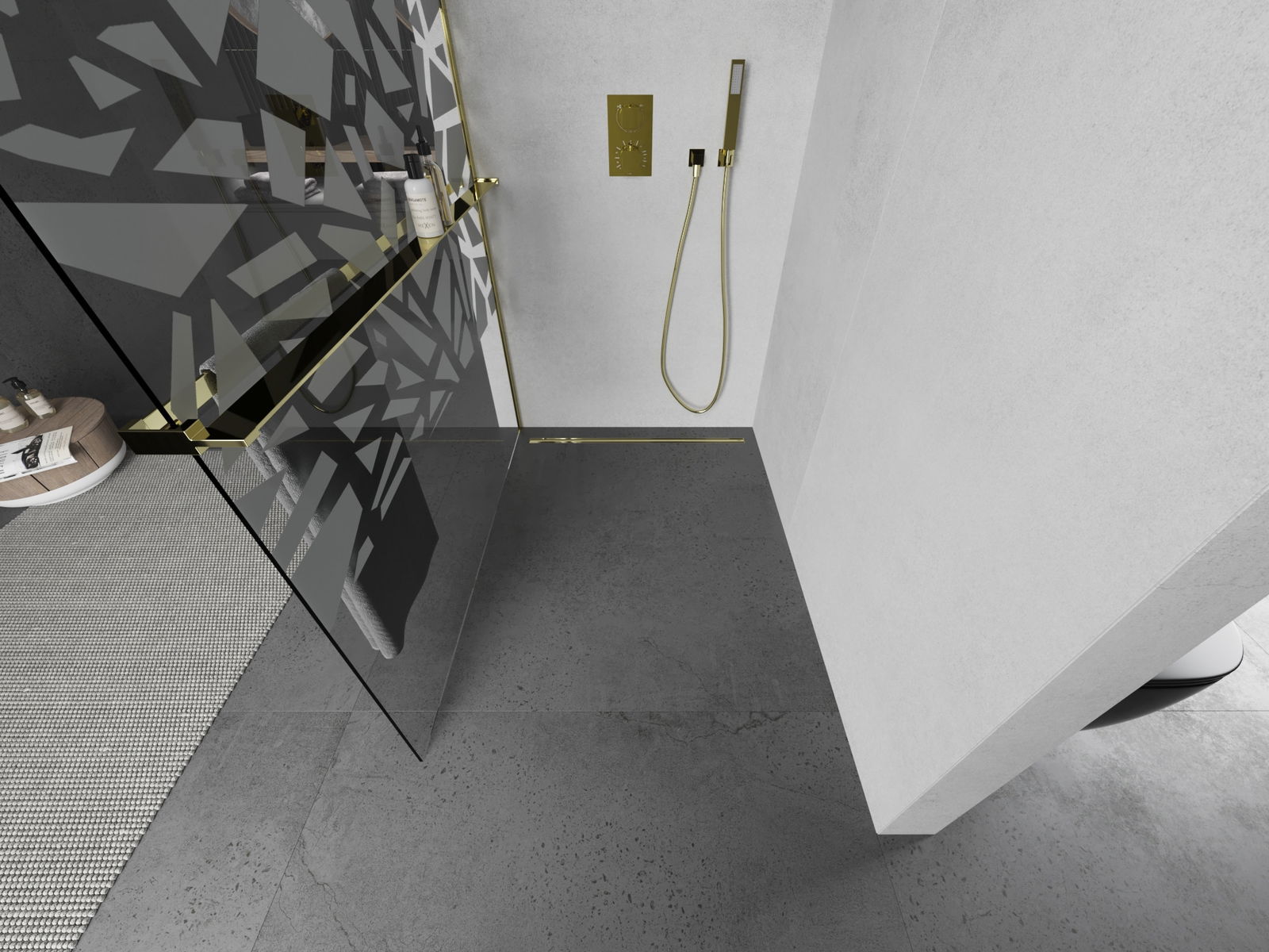 Mexen Kioto+ sprchová stěna s poličkou Walk-in 70 x 200 cm, bílý vzor, zlatá - 800-070-121-50-85