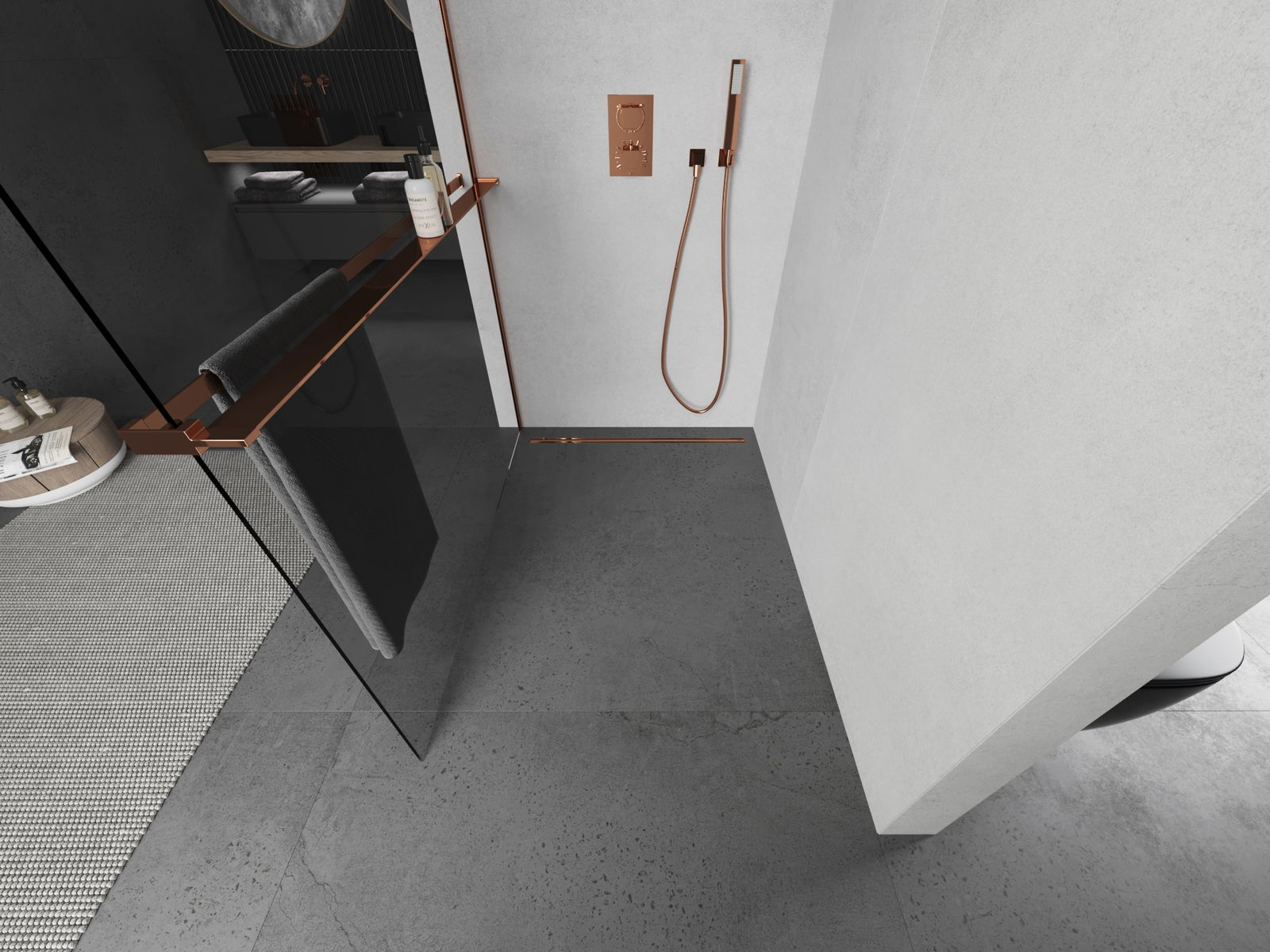 Mexen Kioto+ sprchová zástěna s poličkou Walk-in 130 x 200 cm, transparentní, růžové zlato - 800-130-121-60-00