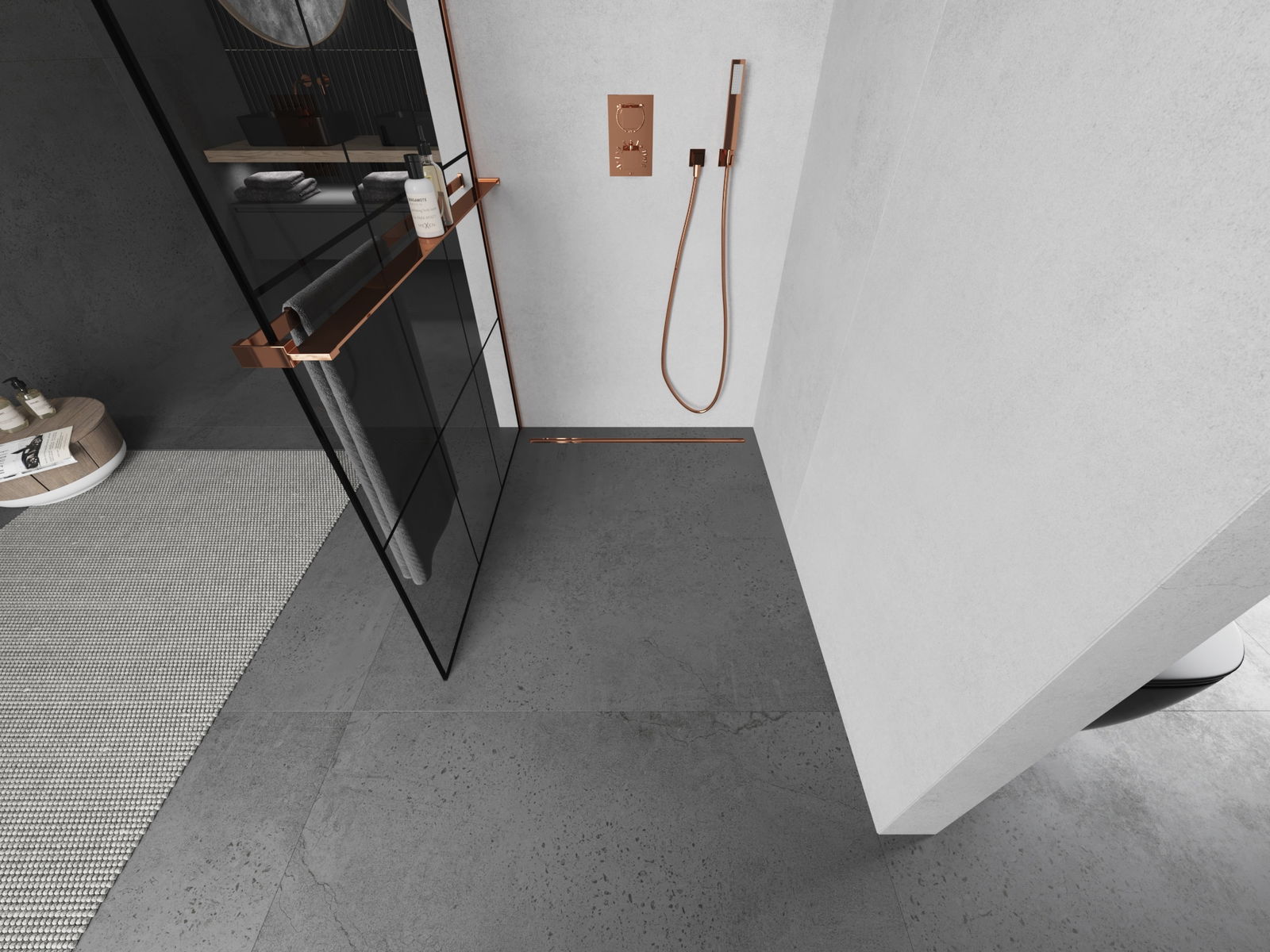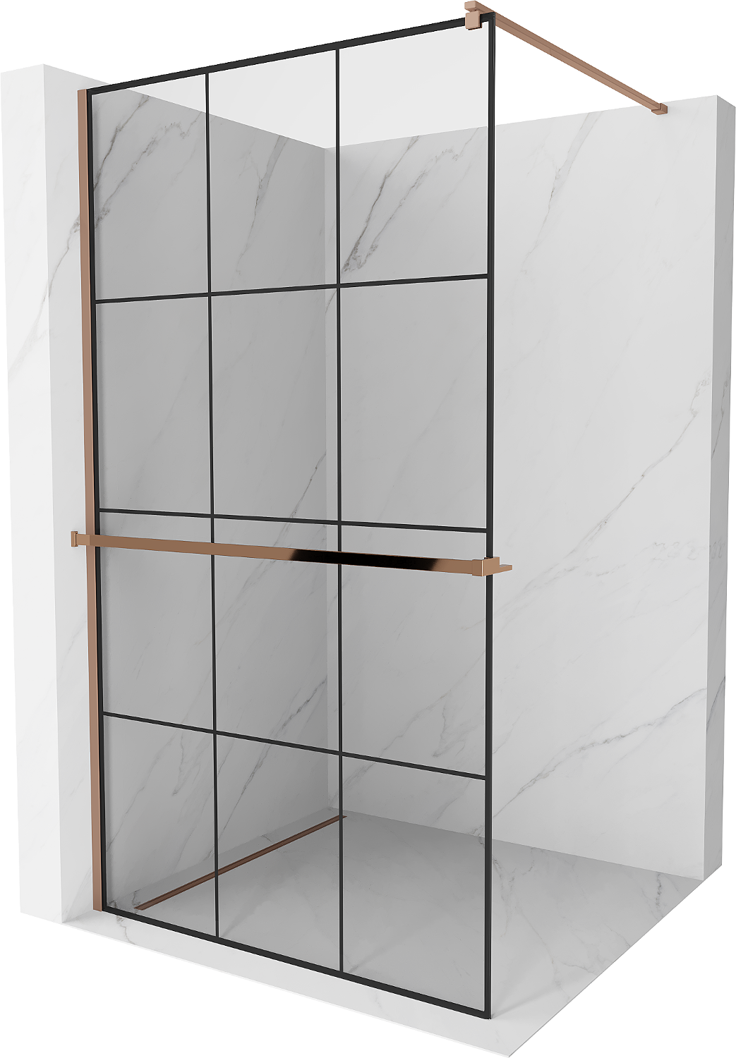 Mexen Kioto+ sprchová stěna s policí Walk-in 110 x 200 cm, černá mřížka, růžové zlato - 800-110-121-60-77