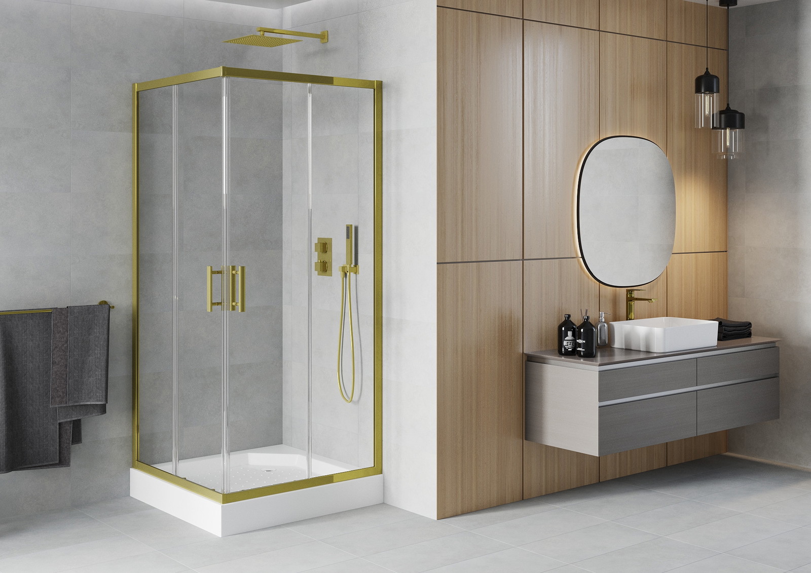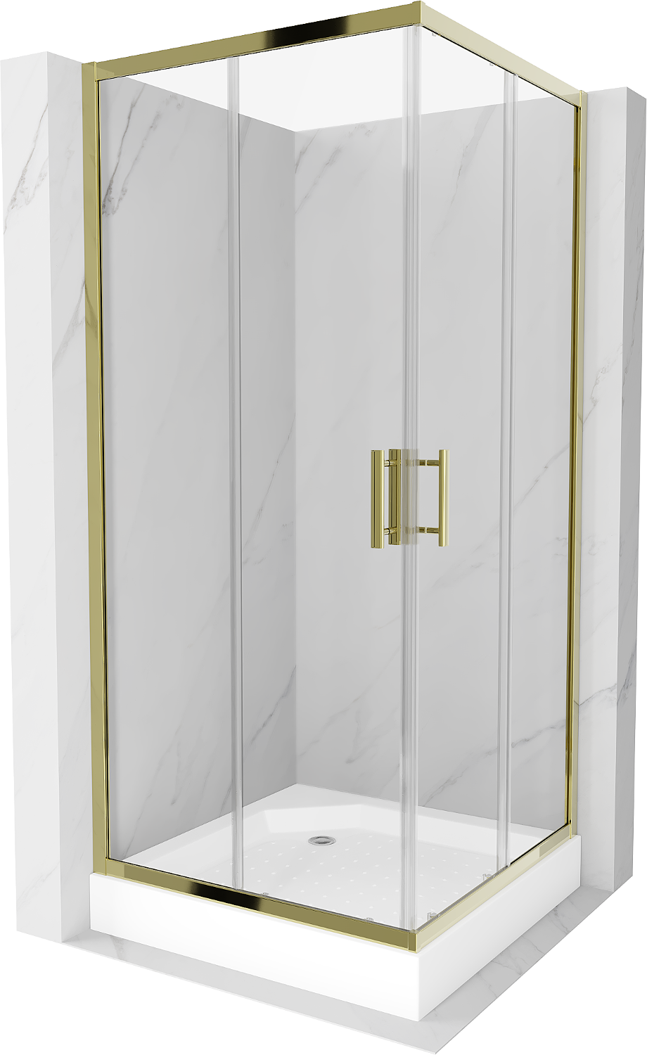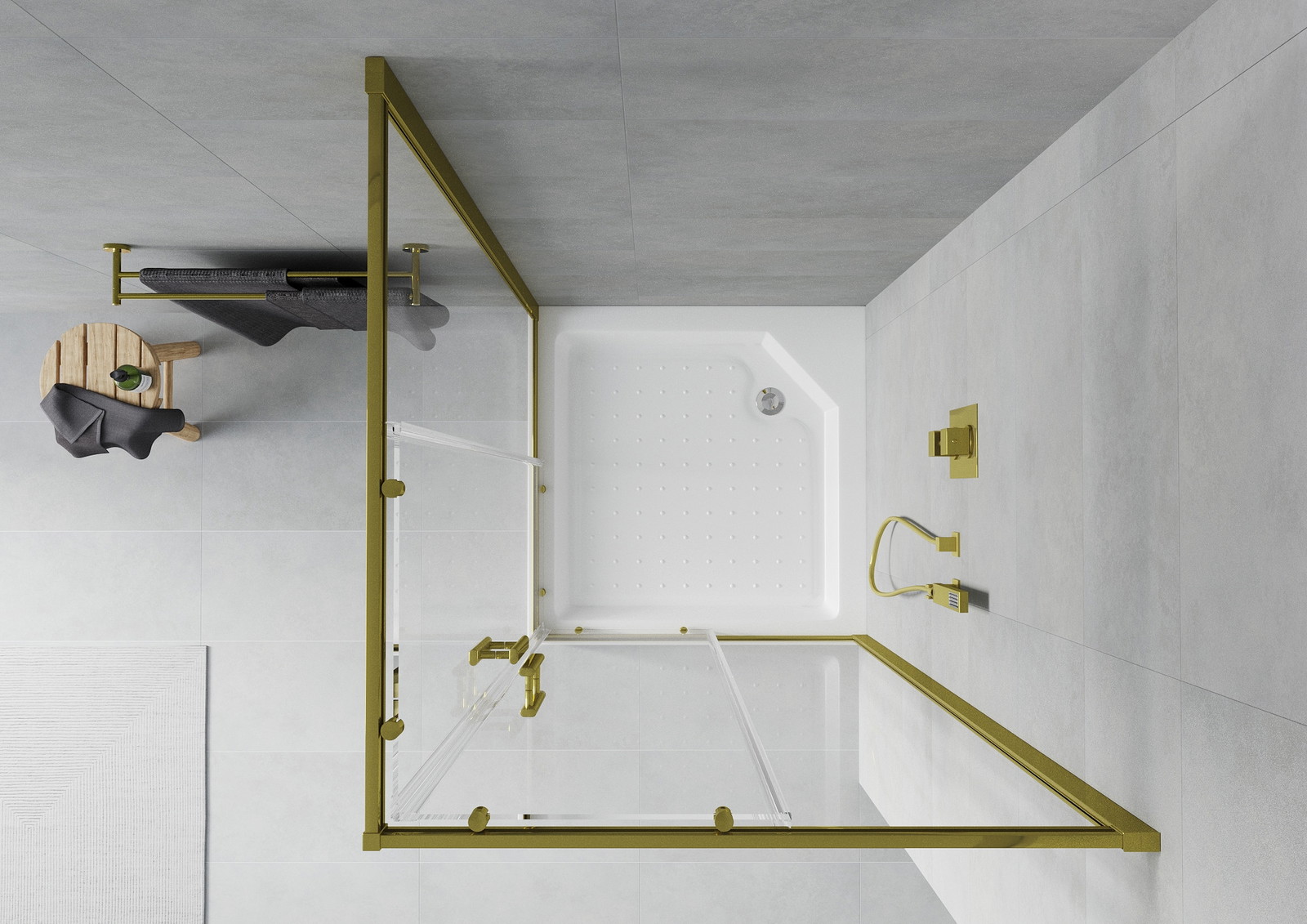 Mexen Rio čtvercová sprchová kabina 90 x 90 cm, transparentní, zlatá + sprchová vanička, bílá - 860-090-090-50-00-4510