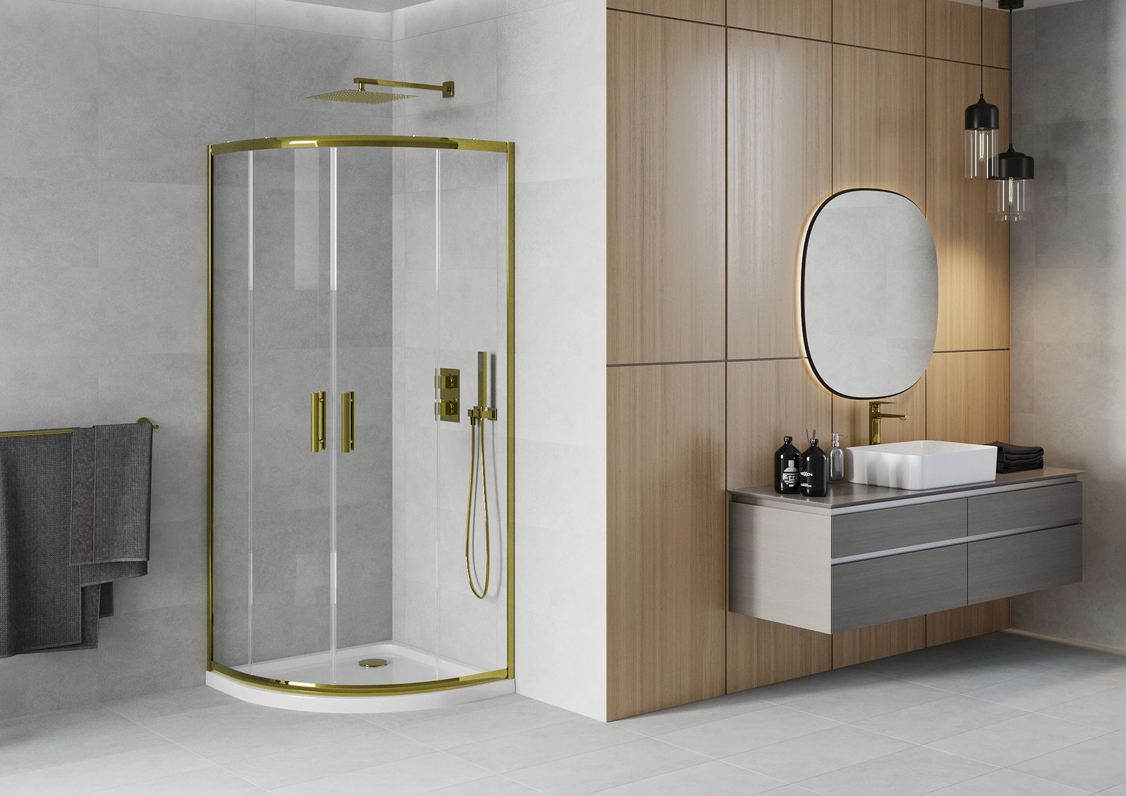 Mexen Rio půlkruhová sprchová kabina 90 x 90 cm, transparentní, zlatá + Flat vanička, bílá - 863-090-090-50-00-4110G