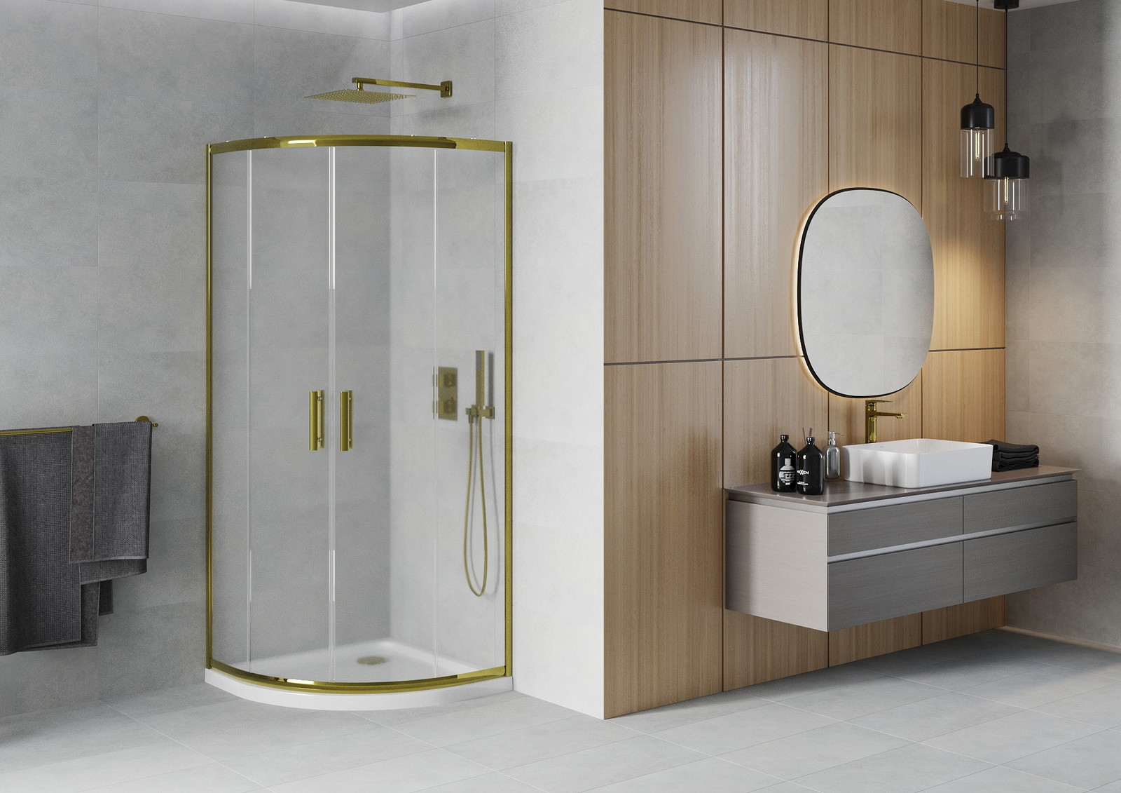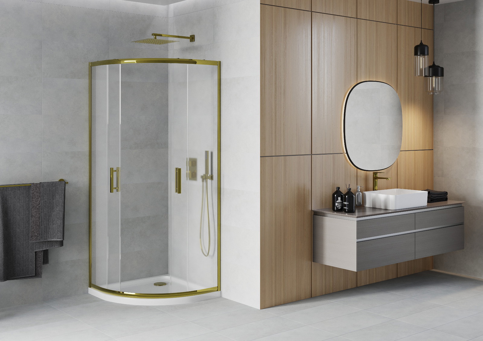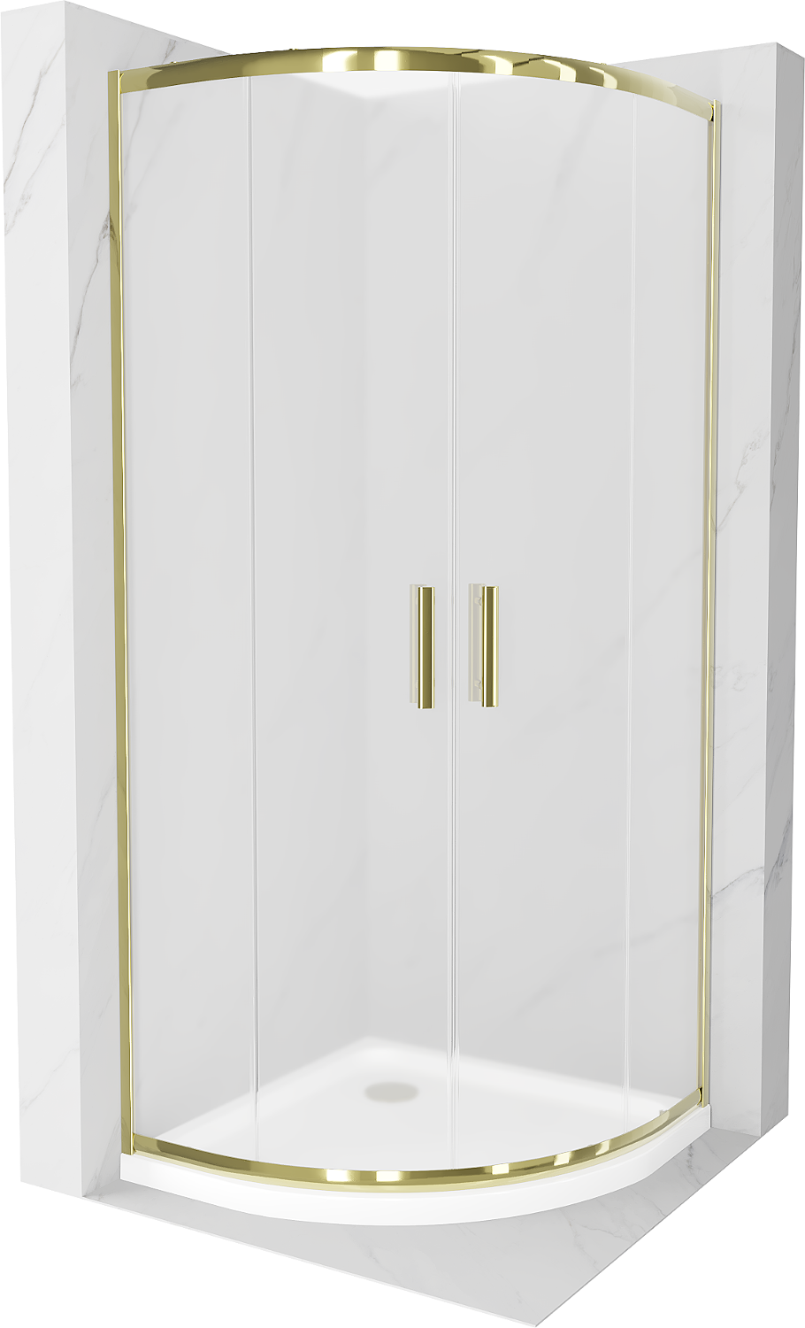 Mexen Rio sprchový kout půlkruhový 90 x 90 cm, matné sklo, zlatý + vanička Flat, bílá - 863-090-090-50-30-4110G