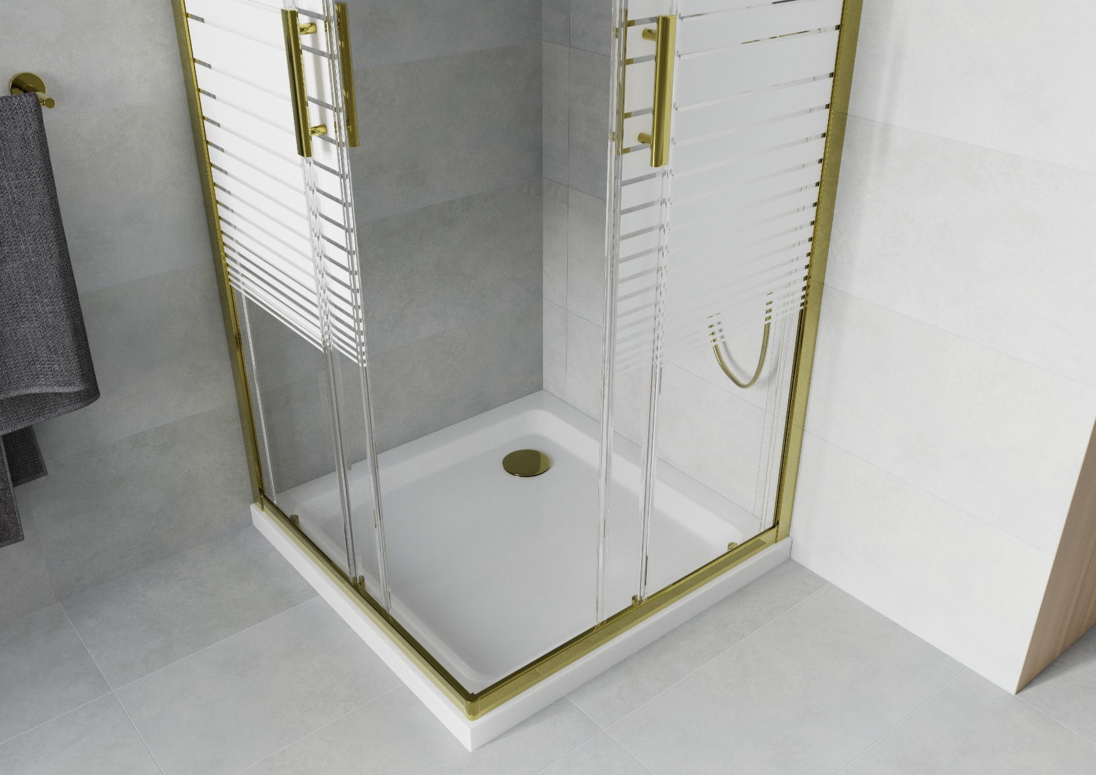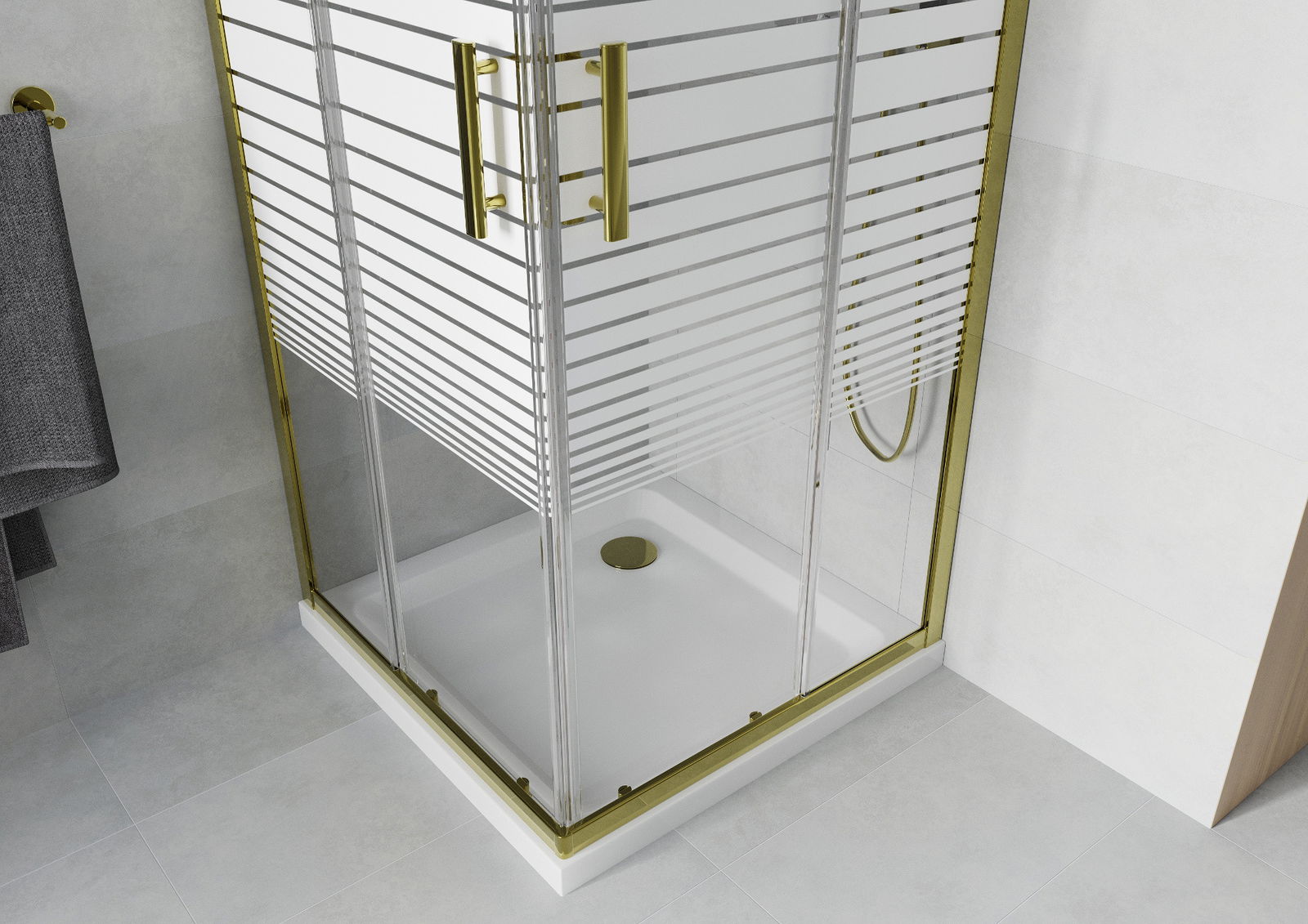 Mexen Rio čtvercový sprchový kout 90 x 90 cm, bílé pruhy, zlatý + plochá vanička, bílá - 860-090-090-50-20-4010G