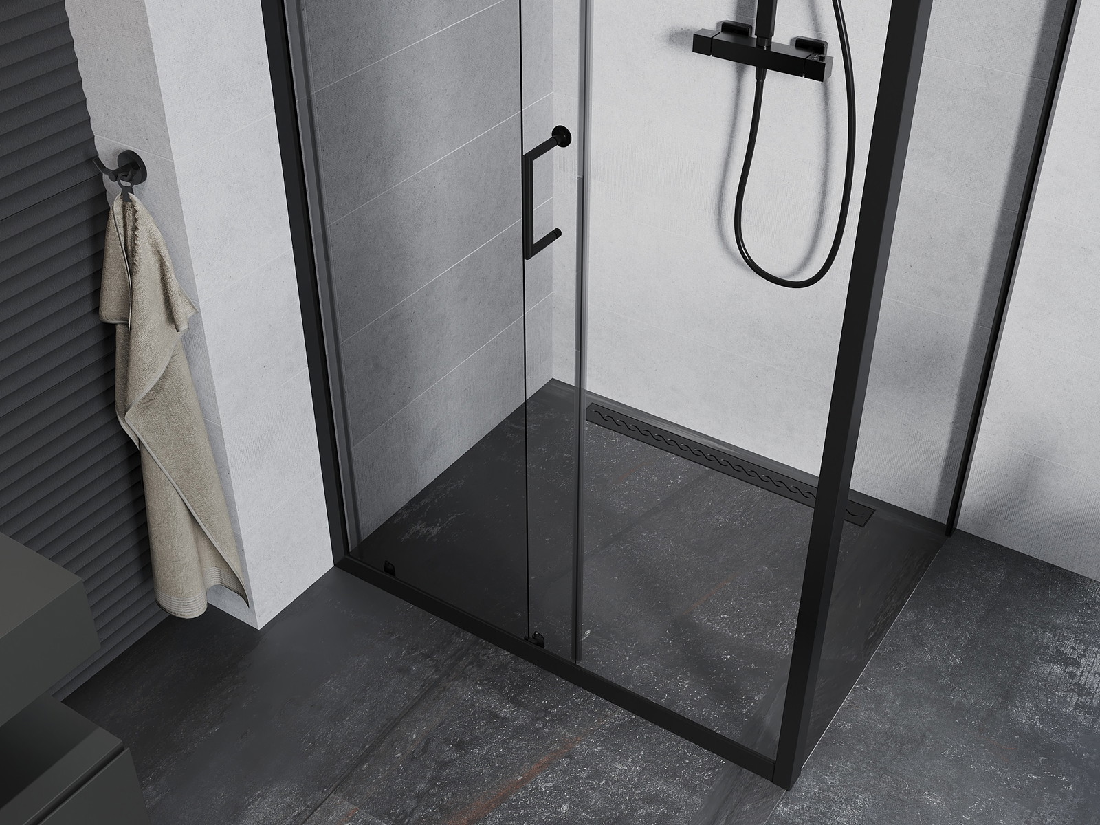 Praktická a pohodlná rukojeť je vyrobena z odolného a trvanlivého kovu. Moderní tvar ve spojení s povrchovou úpravou, která ladí s barvou profilů, dodává celku moderní a stylový vzhled, zdůrazňující estetiku každé koupelny.