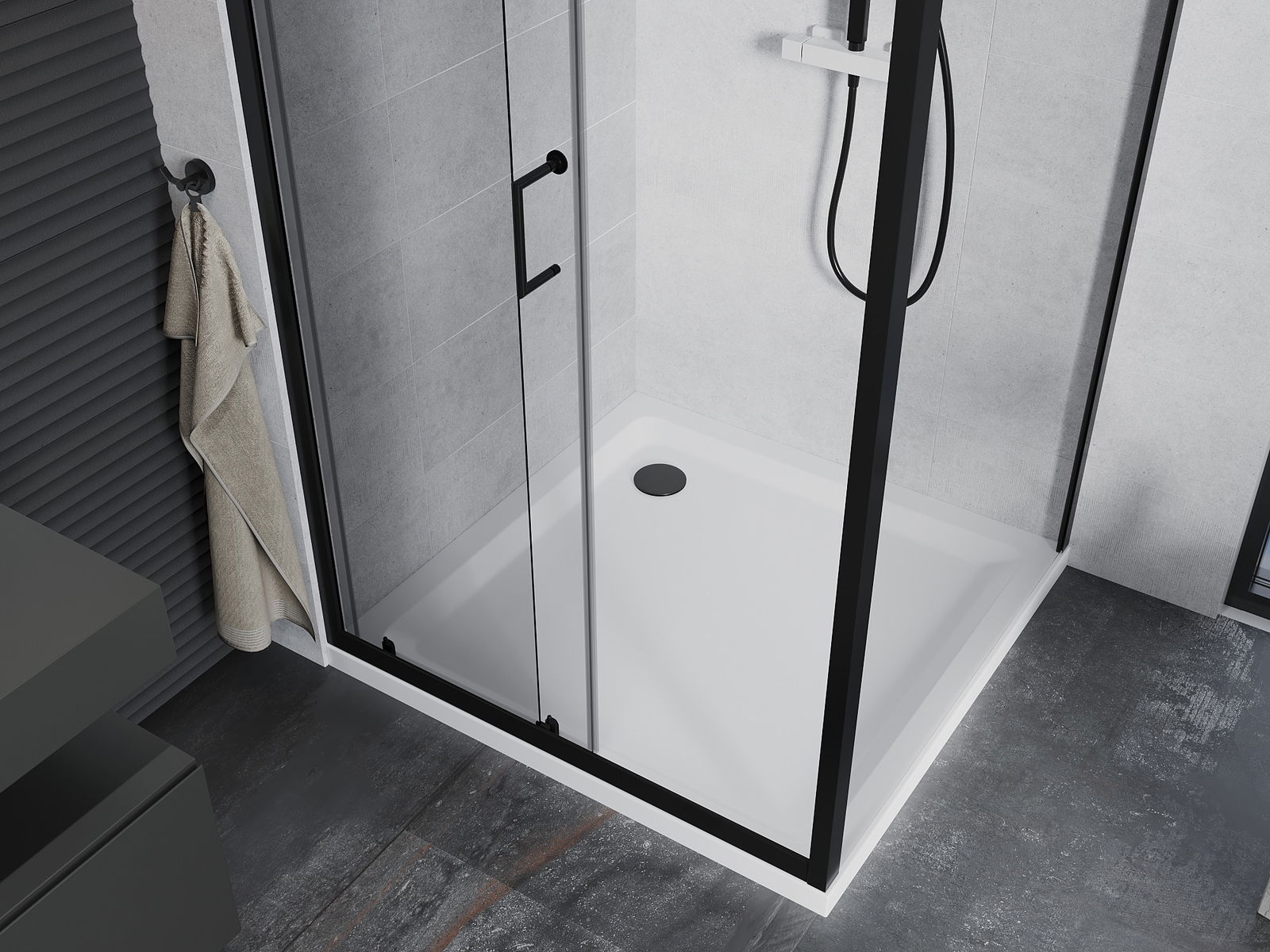 Praktická a pohodlná rukojeť je vyrobena z odolného a trvanlivého kovu. Moderní tvar ve spojení s povrchovou úpravou, která ladí s barvou profilů, dodává celku moderní a stylový vzhled, zdůrazňující estetiku každé koupelny.