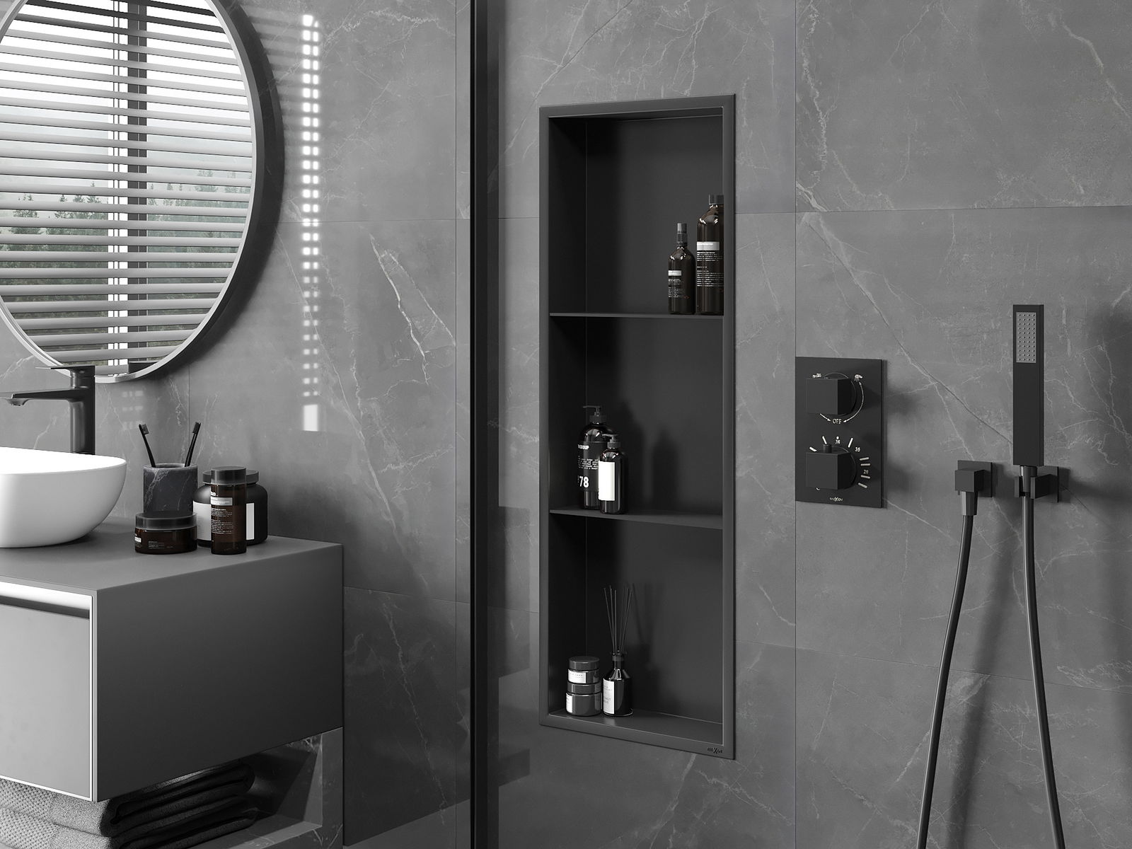 Možnost montáže ve zdi nebo ve speciálně připravené konstrukci. Je to mimořádně moderní a funkční řešení, umožňující ušetřit prostor a přizpůsobit produkt estetice interiéru a vytvořit jednotnou kompozici.