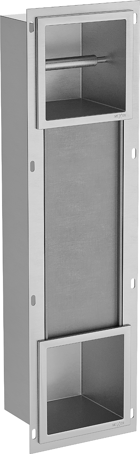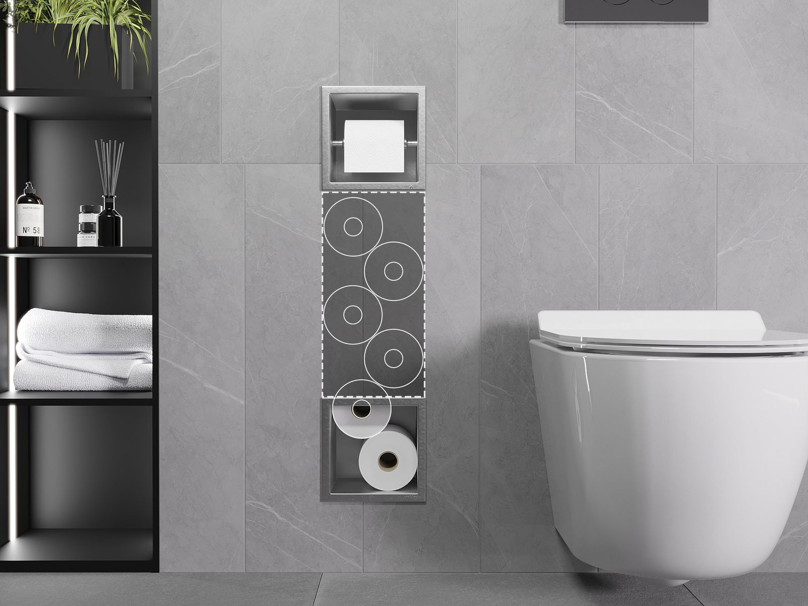 X-wall je praktický držák na toaletní papír s vestavěným zásobníkem ve zdi. Nová role je vždy na dosah ruky a místo dříve určené pro skladování toaletního papíru můžeme využít jiným způsobem.