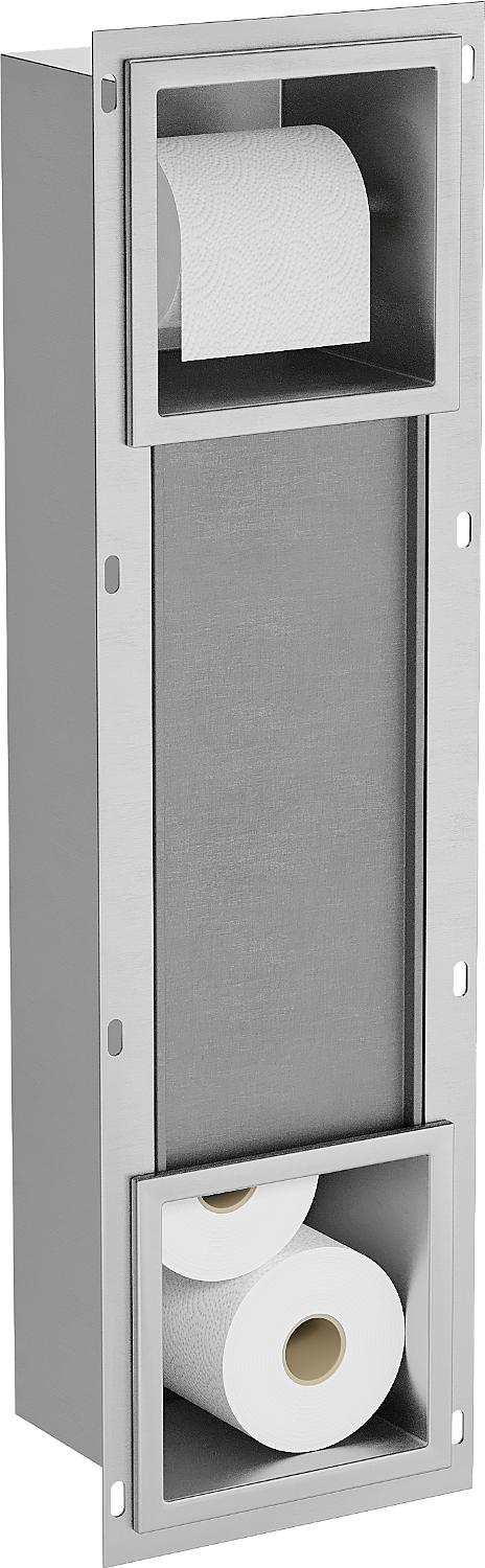 Možnost montáže ve stěně nebo v konstrukci se stelaží pod omítku. Je to nesmírně moderní a funkční řešení, které umožňuje ušetřit prostor a přizpůsobit produkt estetice interiéru a vytvořit jednotnou kompozici.