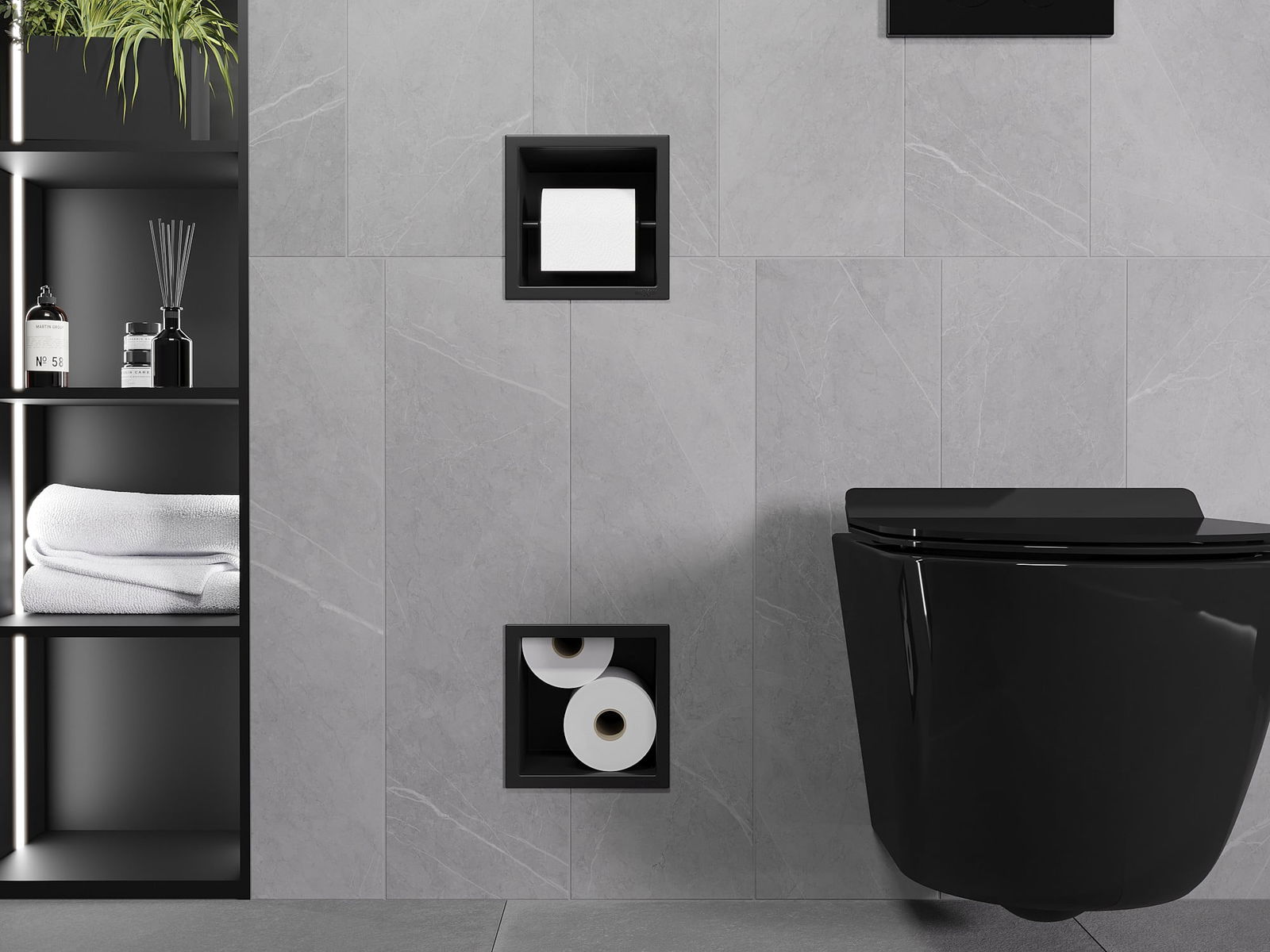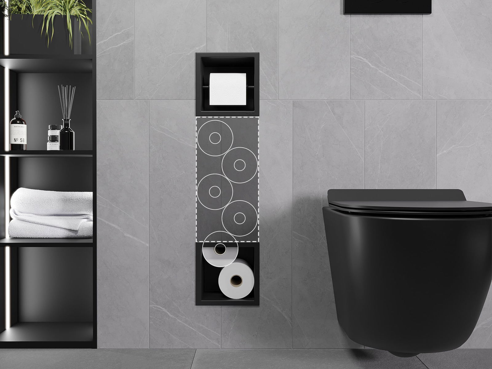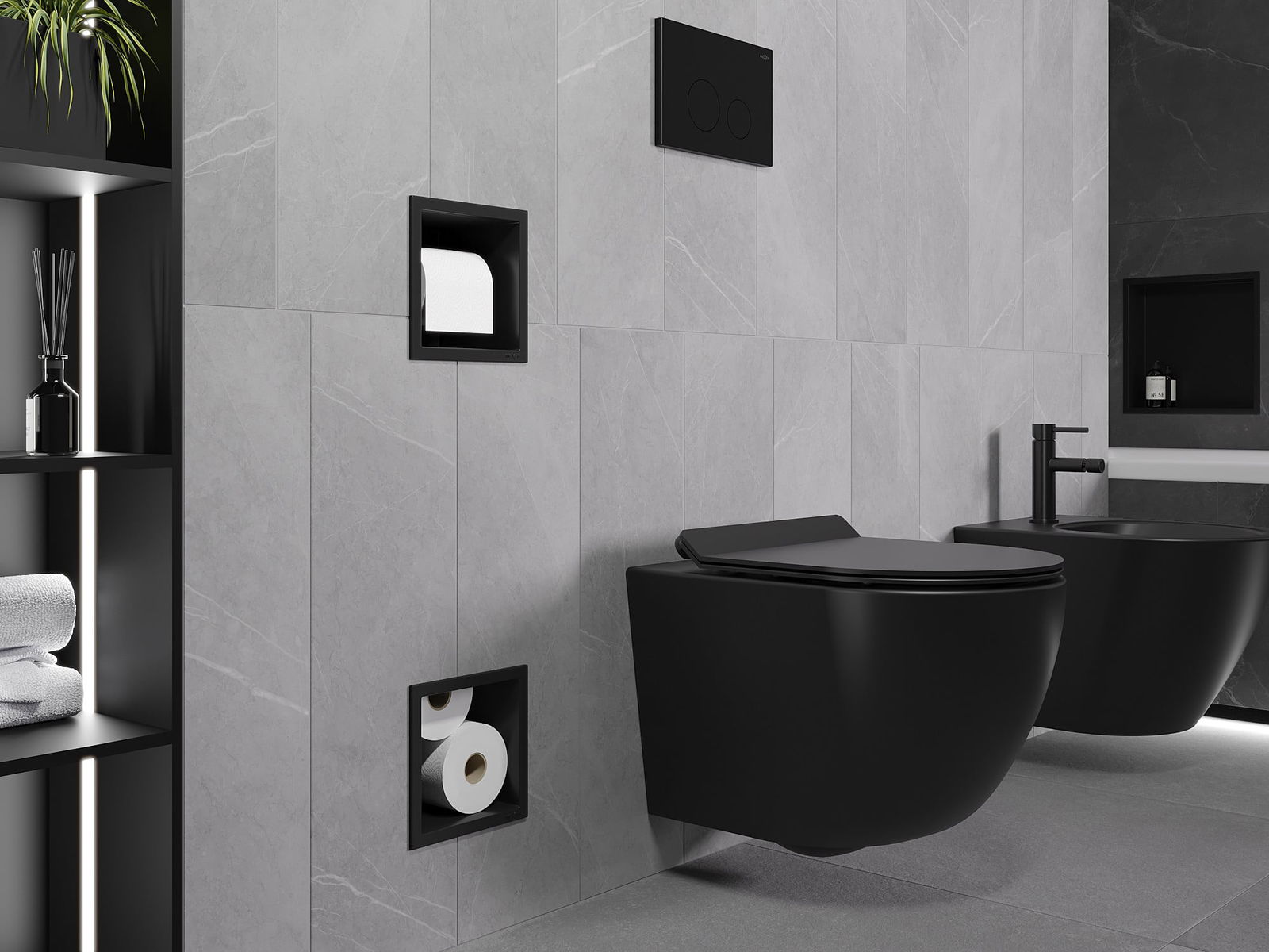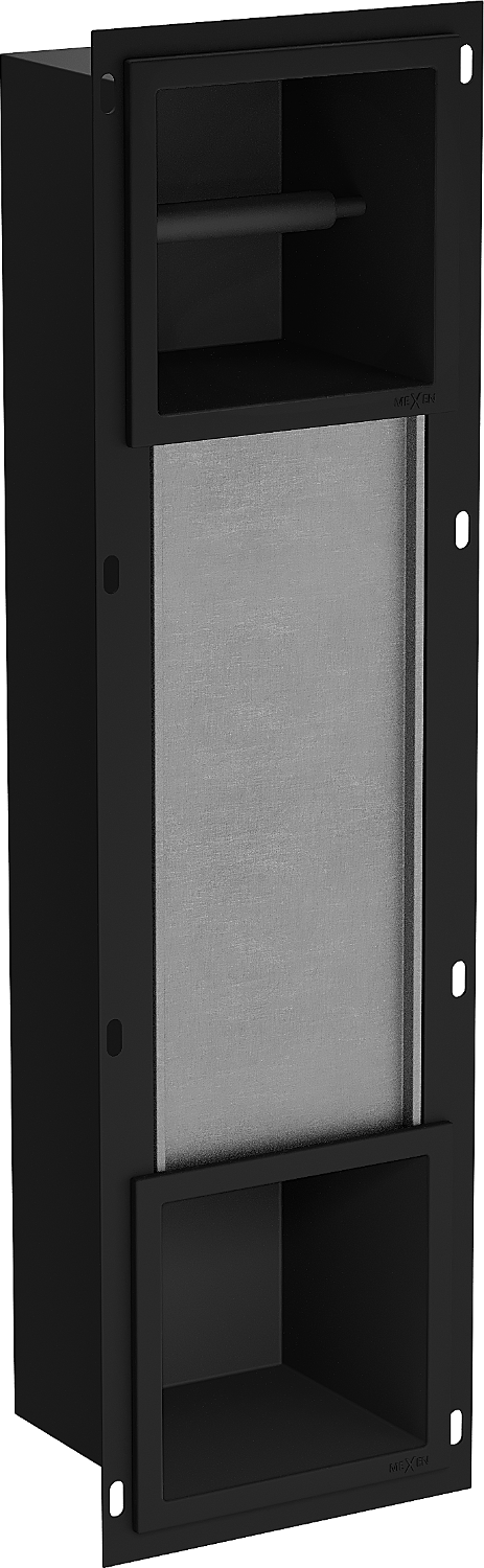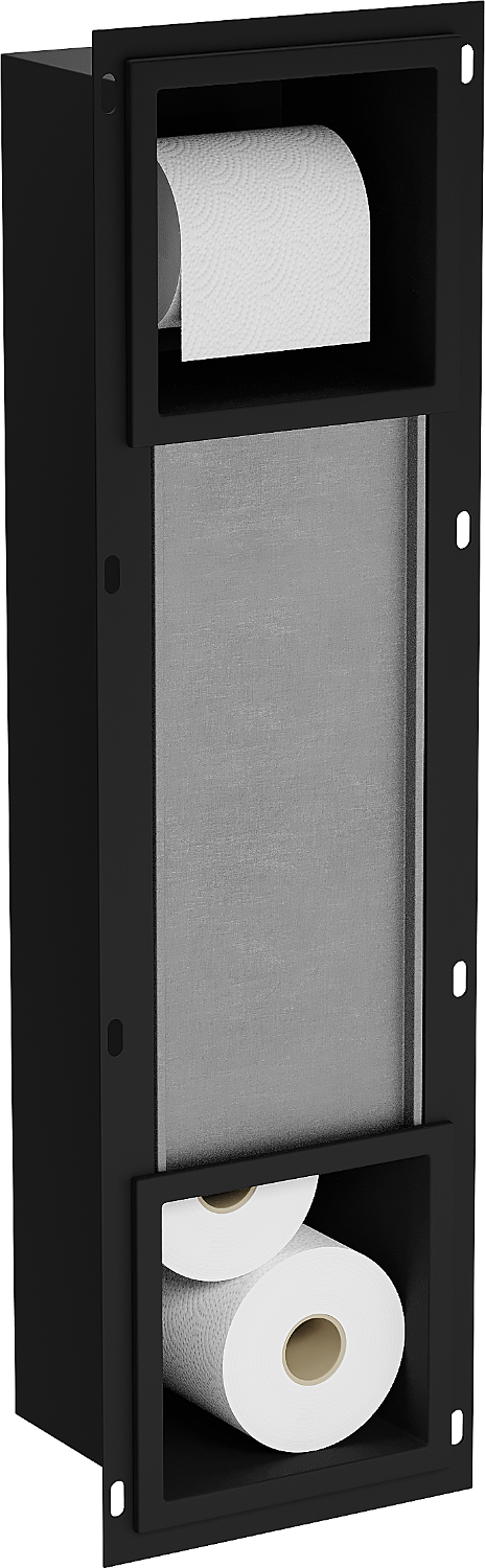 Možnost montáže ve stěně nebo v konstrukci se stelaží pod omítku. Je to nesmírně moderní a funkční řešení, které umožňuje ušetřit prostor a přizpůsobit produkt estetice interiéru a vytvořit jednotnou kompozici.