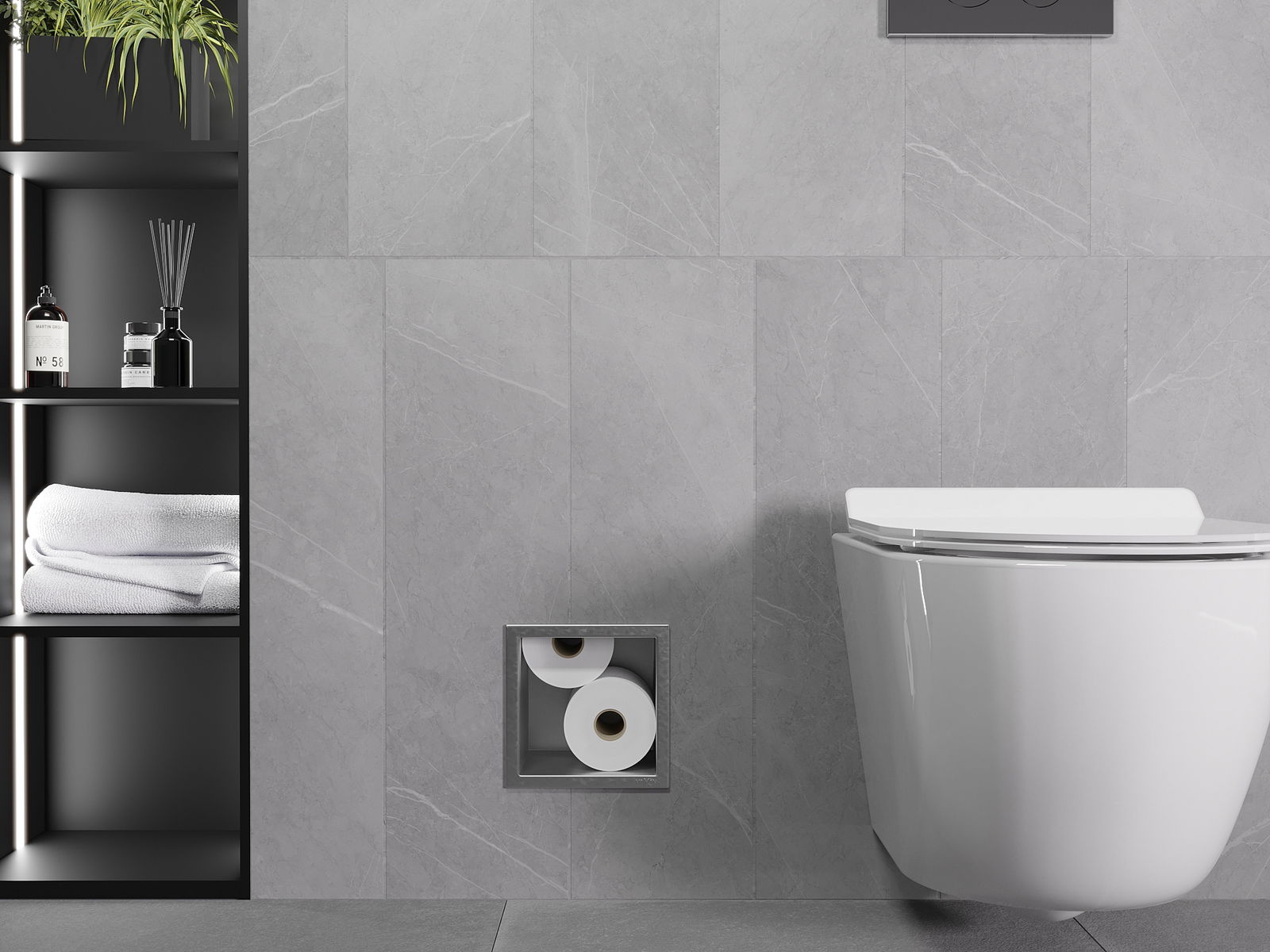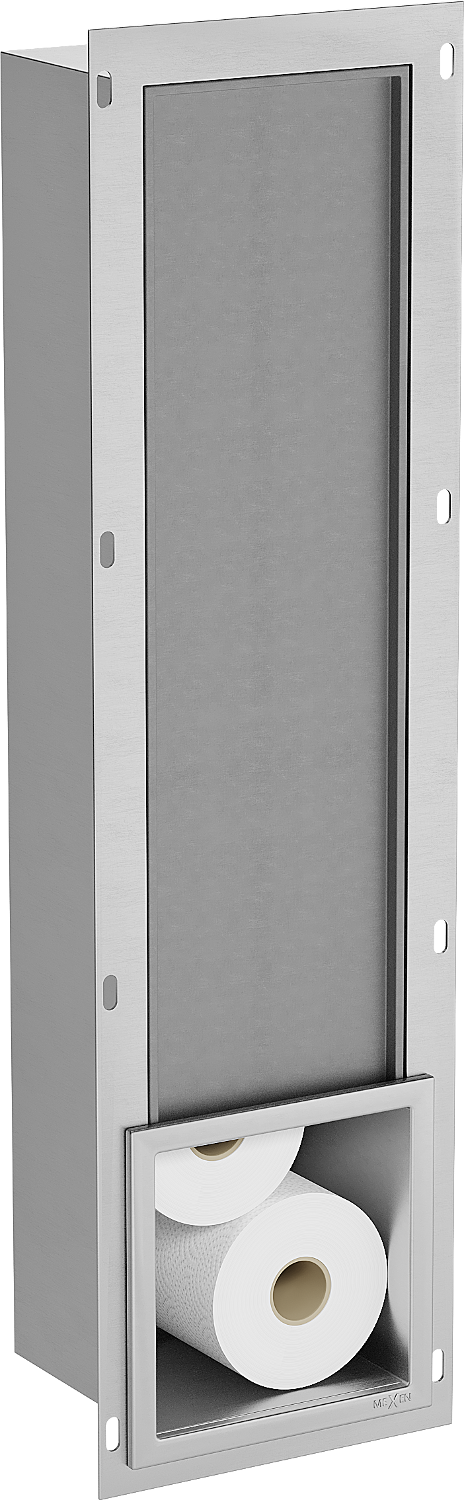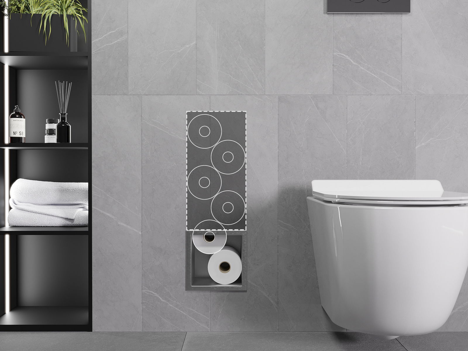 X-wall je praktický držák na toaletní papír s vestavěným zásobníkem ve zdi. Nová role je vždy na dosah ruky a místo dříve určené pro skladování toaletního papíru můžeme využít jiným způsobem.