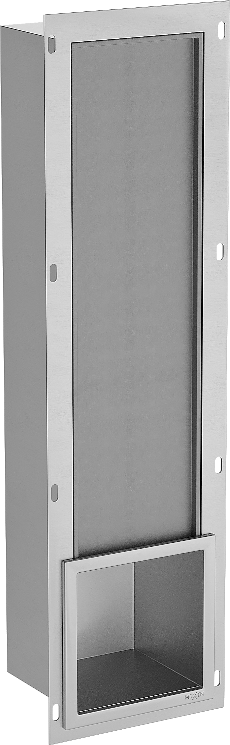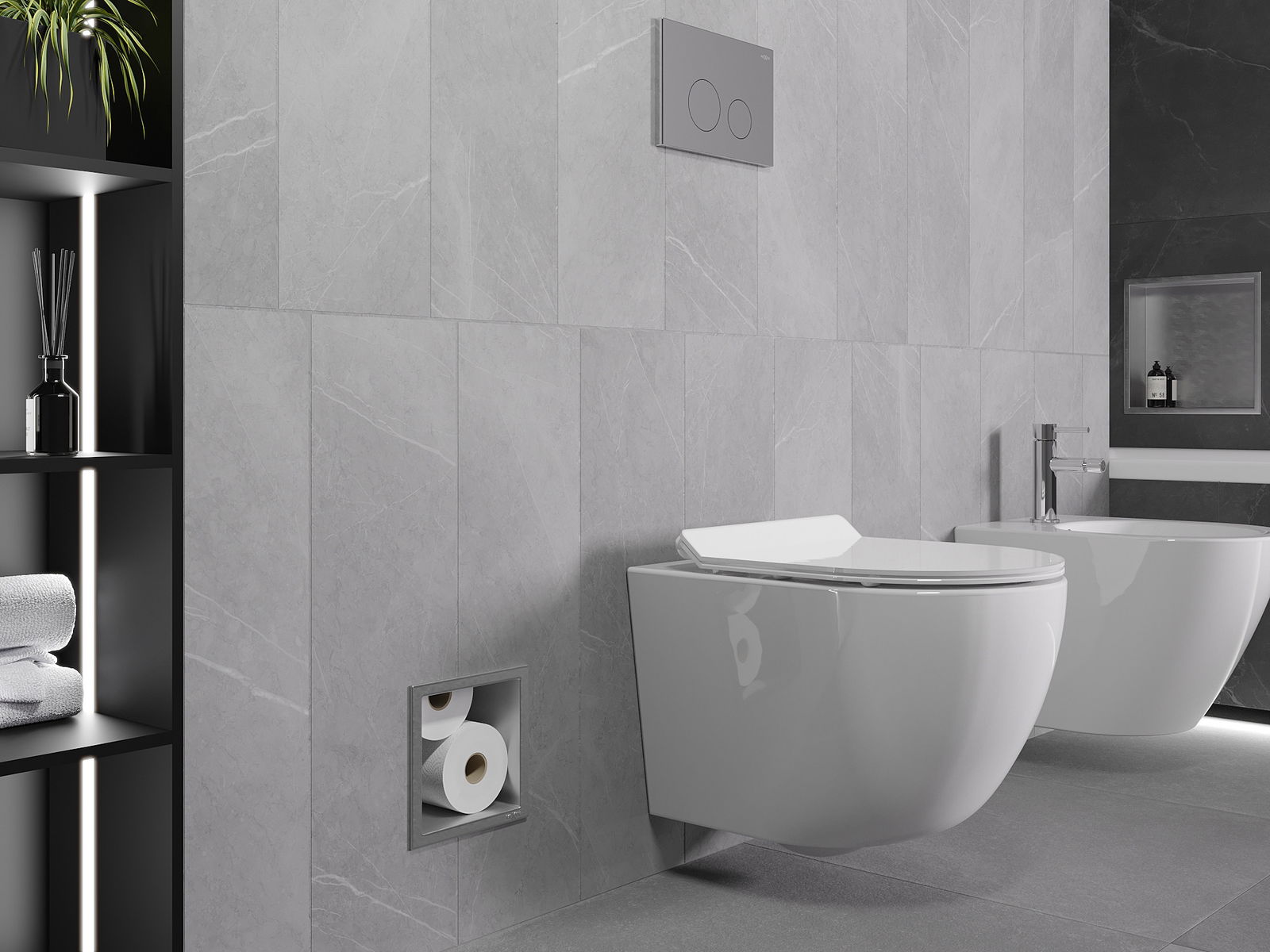 Možnost montáže ve stěně nebo v konstrukci se stelaží pod omítku. Je to nesmírně moderní a funkční řešení, které umožňuje ušetřit prostor a přizpůsobit produkt estetice interiéru a vytvořit jednotnou kompozici.