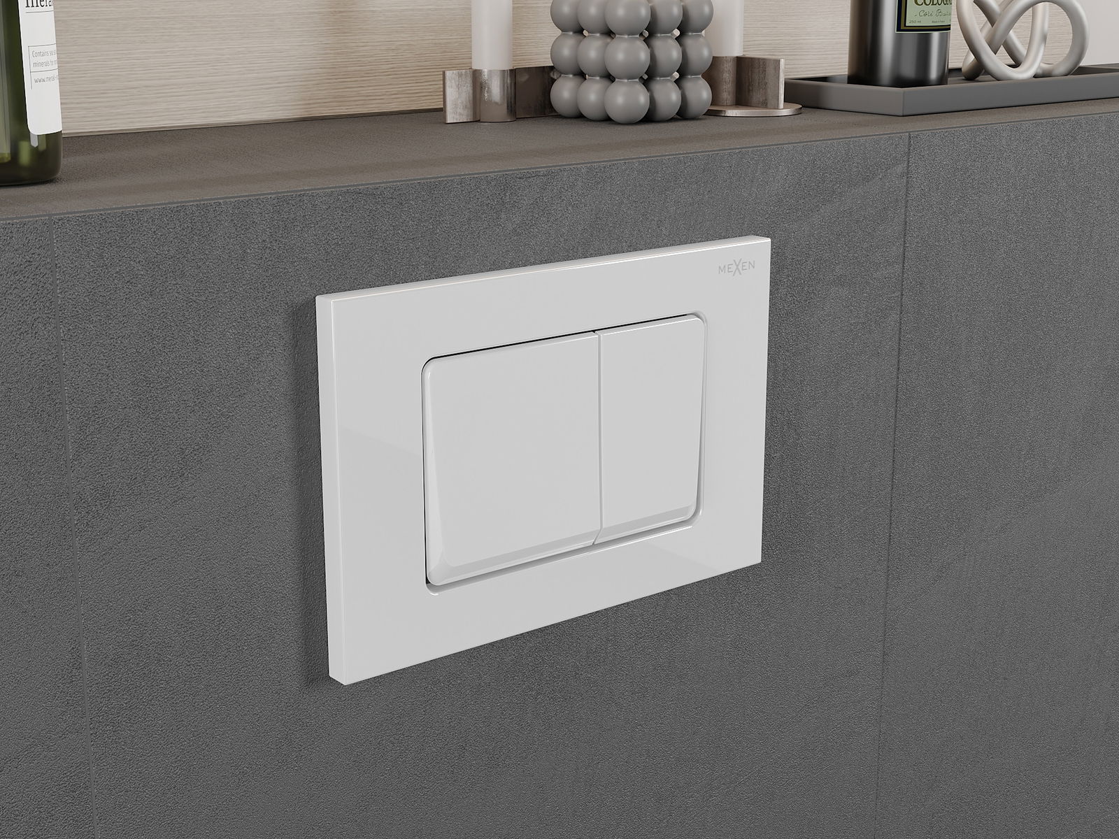 Tlačítko je určeno pro rámy Mexen ze série XS. Může být montováno jak zepředu, tak i shora rámu, což zvyšuje jeho univerzálnost. Takové řešení usnadňuje instalaci v různých montážních podmínkách. Díky tomu je obsluha splachování pohodlná a intuitivní.