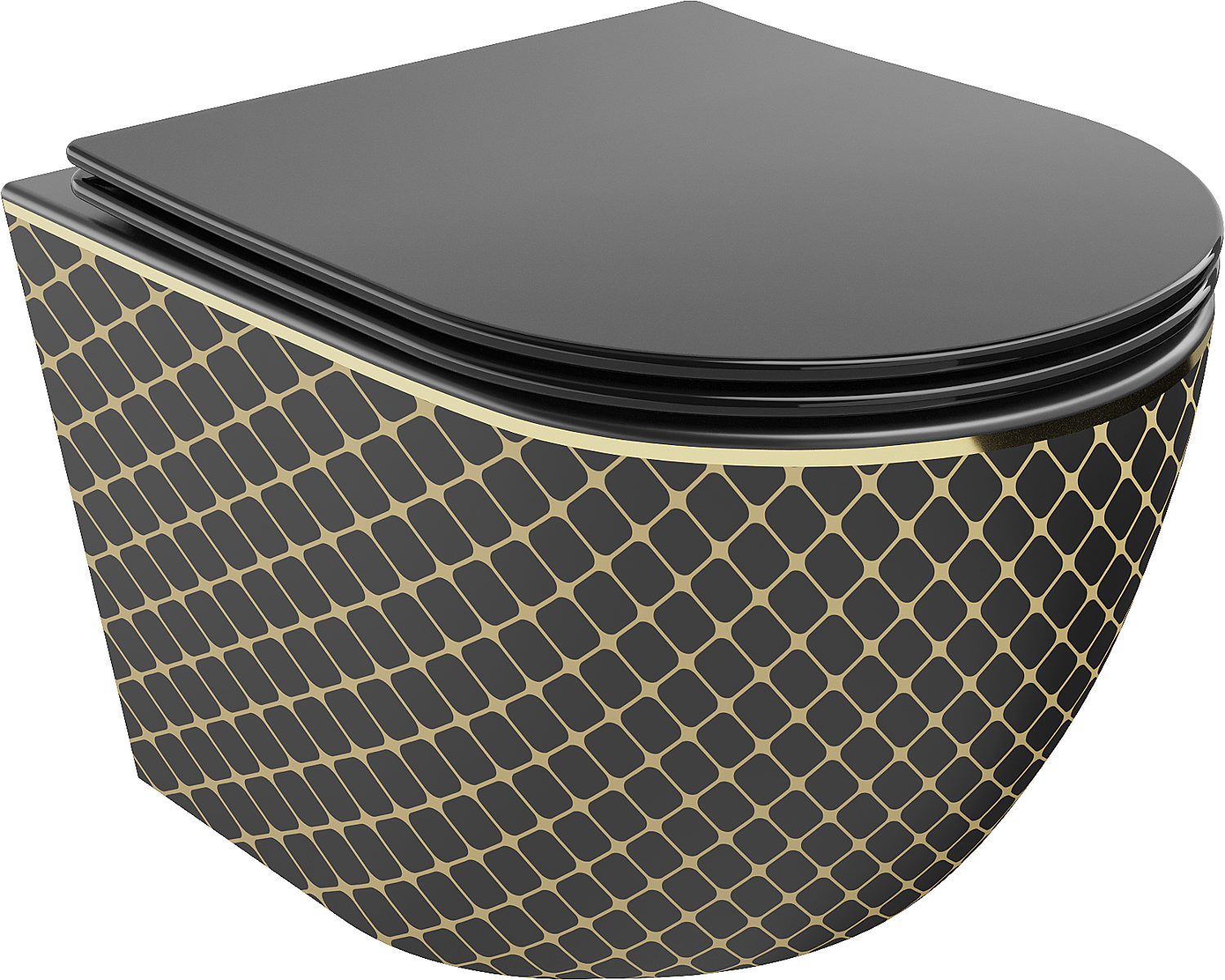 Mexen Lena mísa WC Rimless s pomalu sklápějícím sedátkem slim, duroplast, černá mat/zlatý vzor mřížka - 30224079