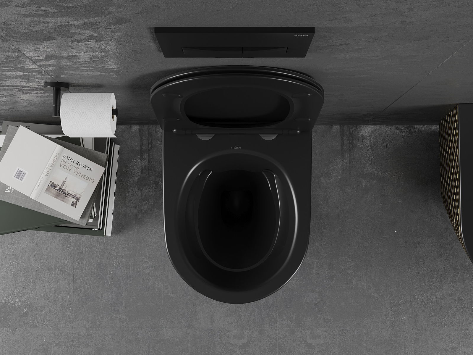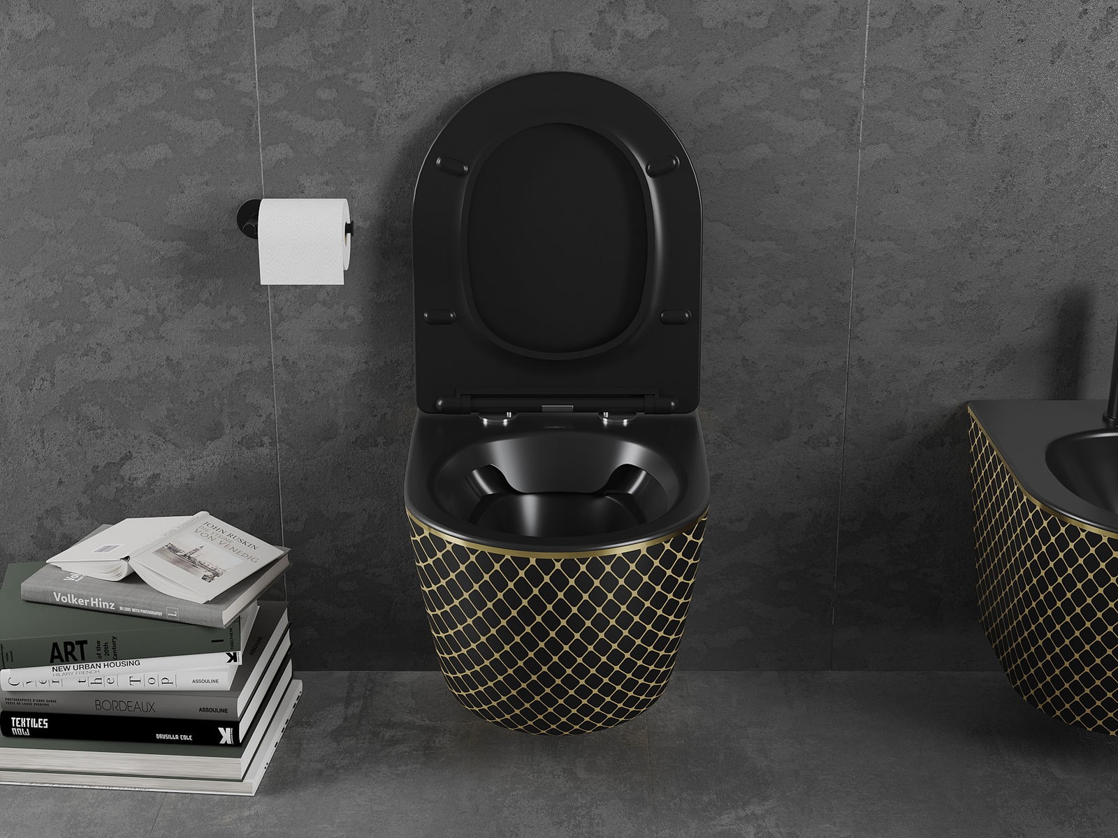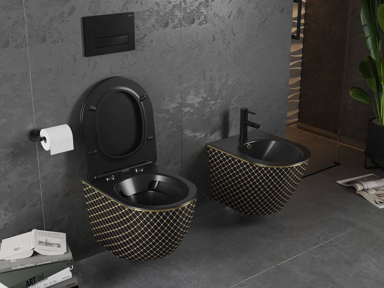 • Mexen Lena mísa WC Rimless s pomalu sklápějícím sedátkem slim, duroplast, černá mat/zlatý vzor mřížka - 30224079