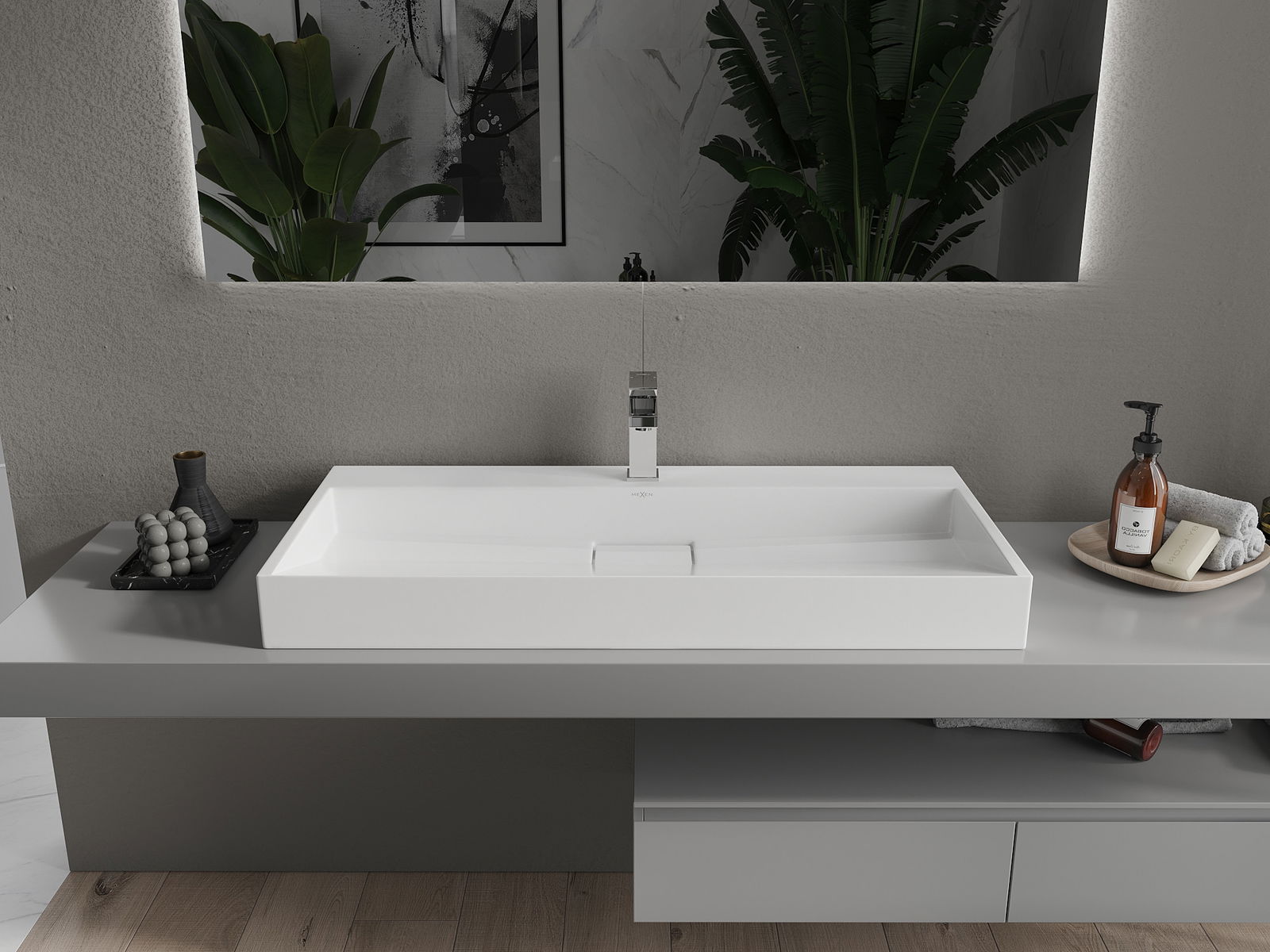 Umyvadlo má otvor, ve kterém lze namontovat baterii. Umožňuje to ušetřit cenný prostor v koupelně a zvýraznit její estetiku. Toto řešení také usnadňuje udržování čistoty kolem umyvadla.