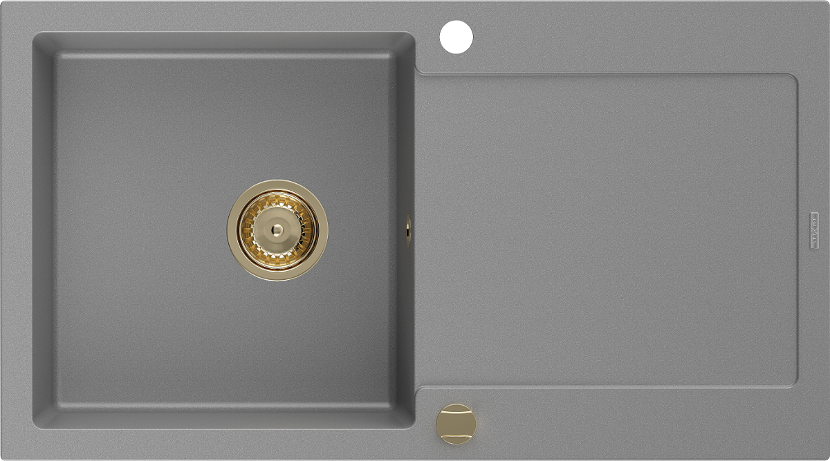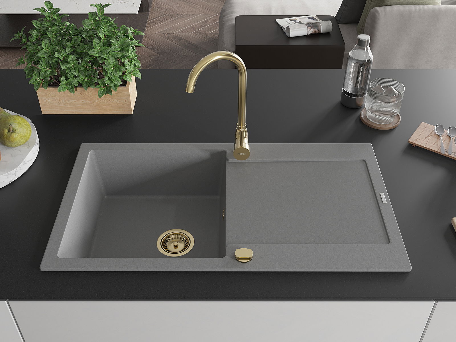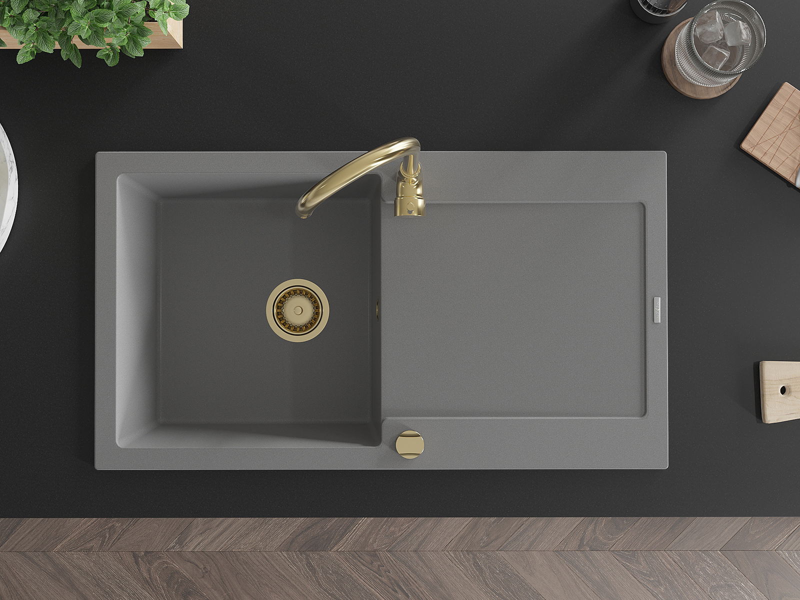 Mexen Leo žulový dřez 1-komorový s odkapávačem 900 x 500 mm, šedý, sifon zlatý - 6501901010-71-G