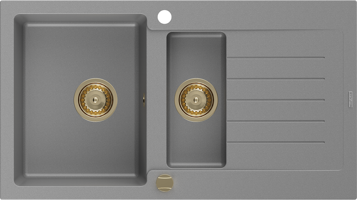 Mexen Matias granitový dřez 1,5-komorový s odkapávačem 900 x 505 mm, šedý, sifon zlatý - 6502901505-71-G