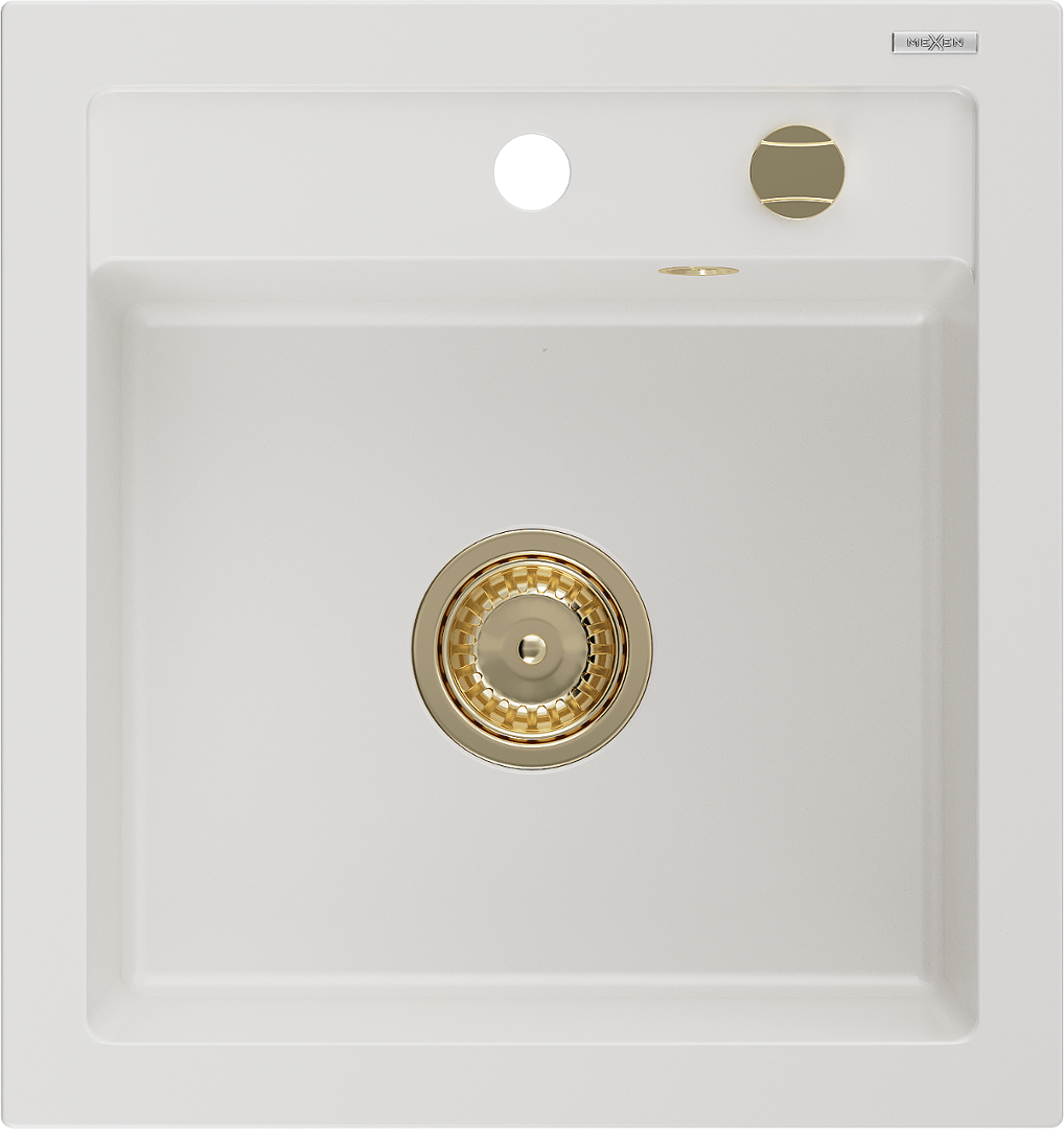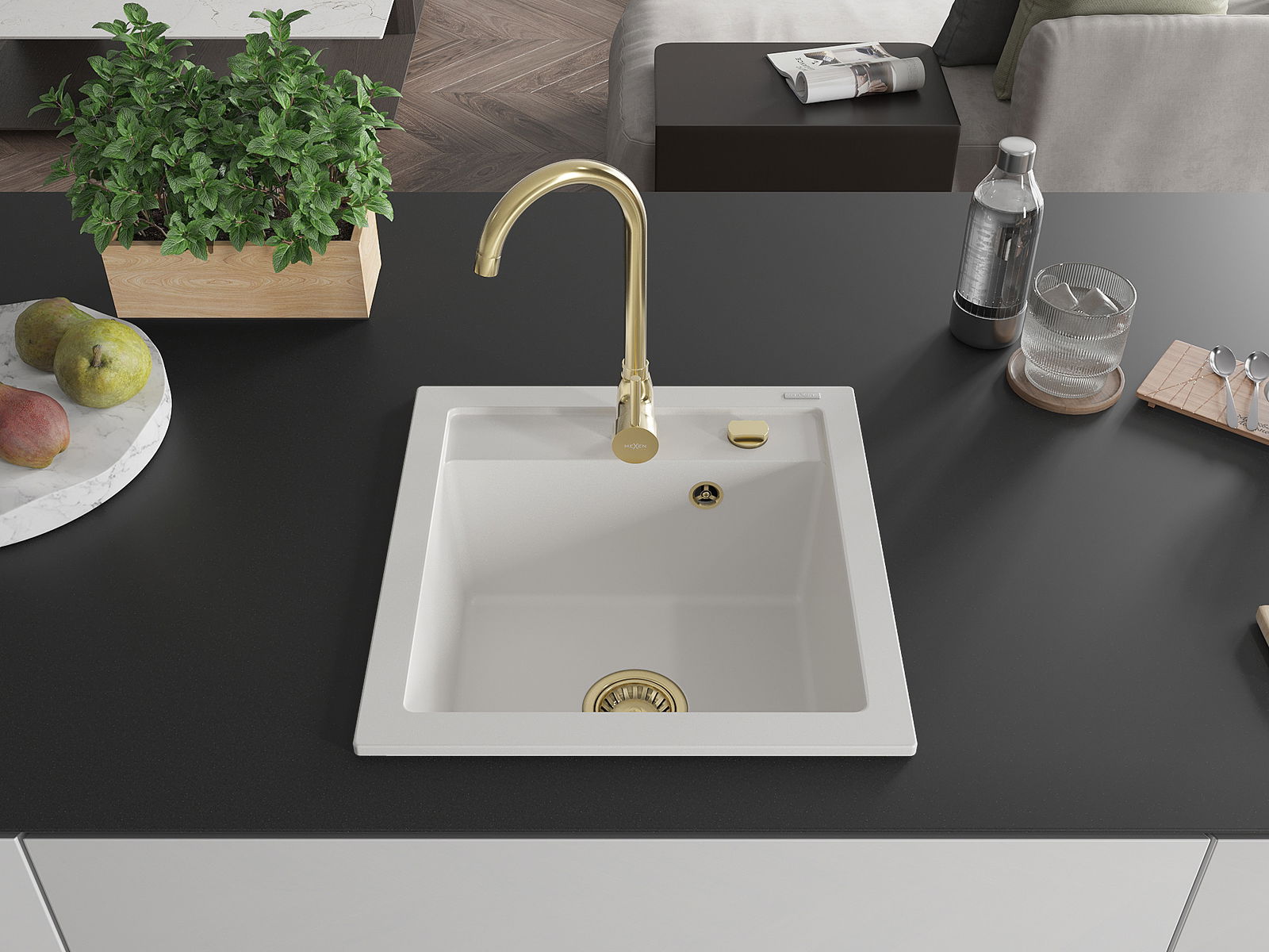 Mexen Vito granitový dřez 1-komorový 520 x 490 mm, bílý, sifon zlatý - 6503521000-20-G