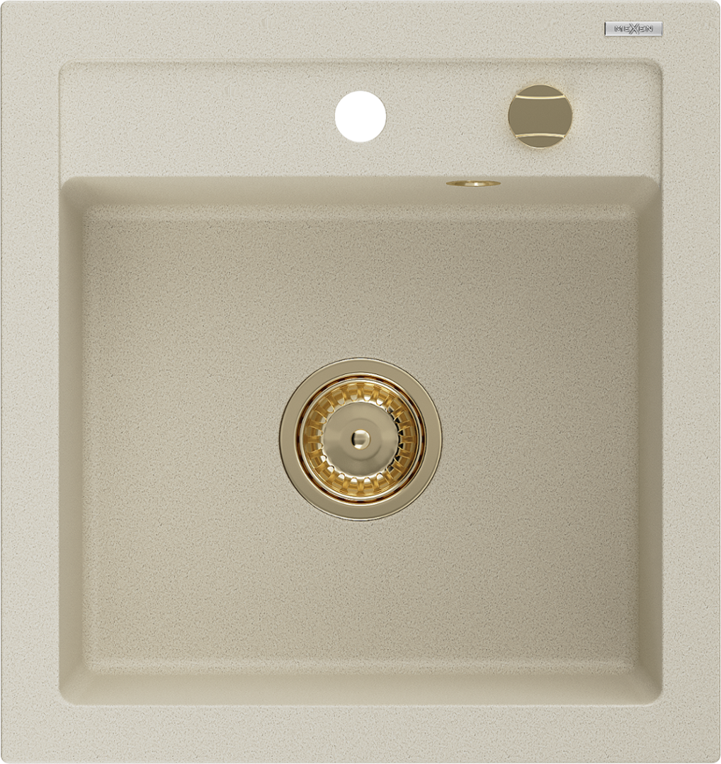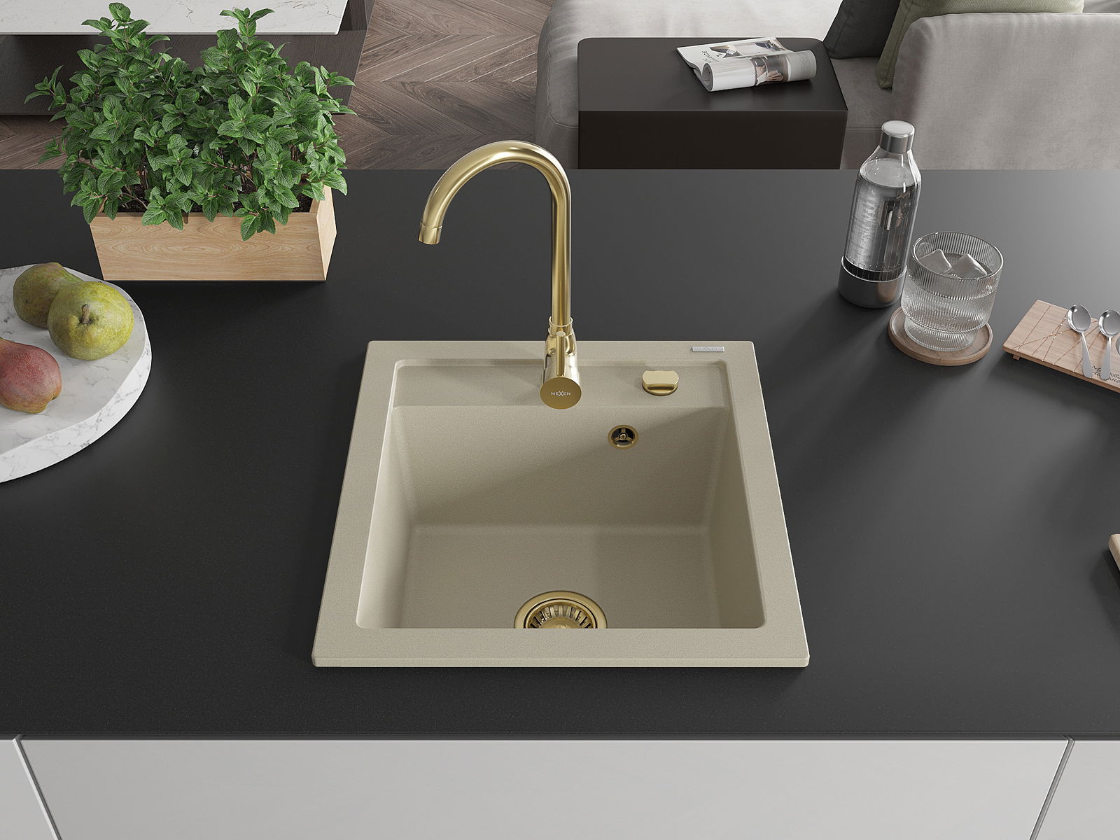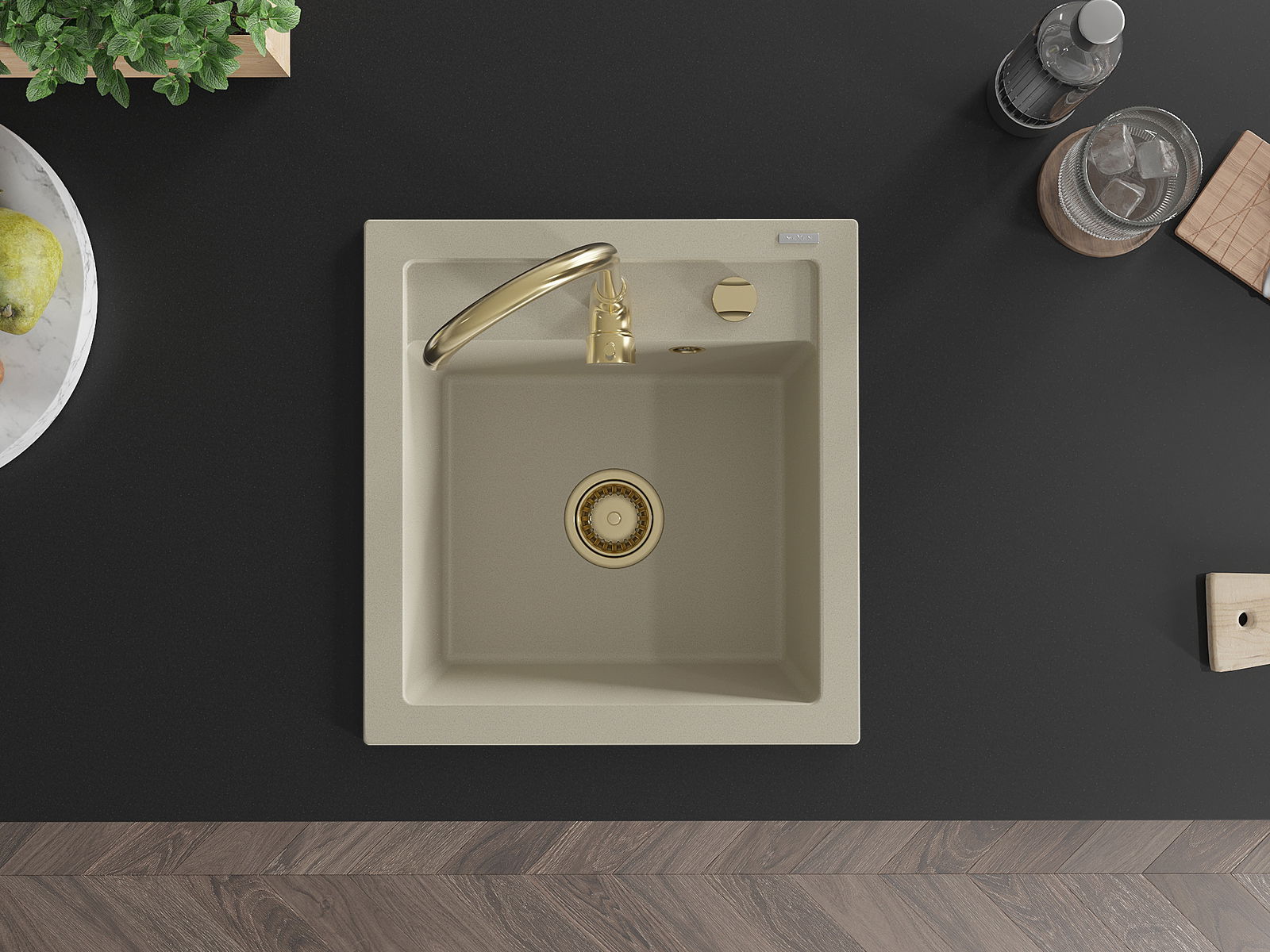 Mexen Vito granitový dřez 1-komorový 520 x 490 mm, béžový, zlatý sifon - 6503521000-69-G