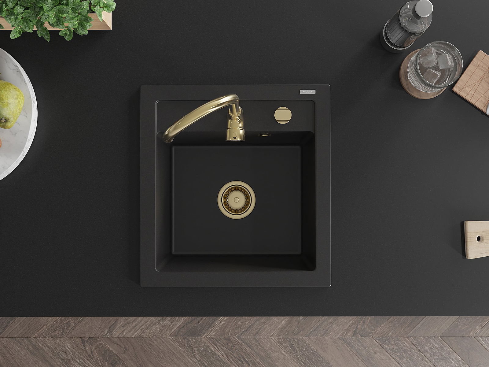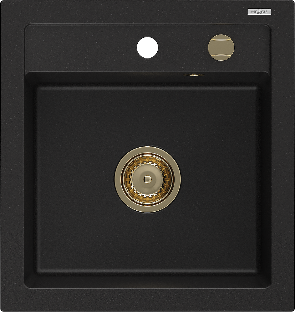 Mexen Vito granitový dřez 1-komorový 520 x 490 mm, černý, sifon zlatý - 6503521000-77-G
