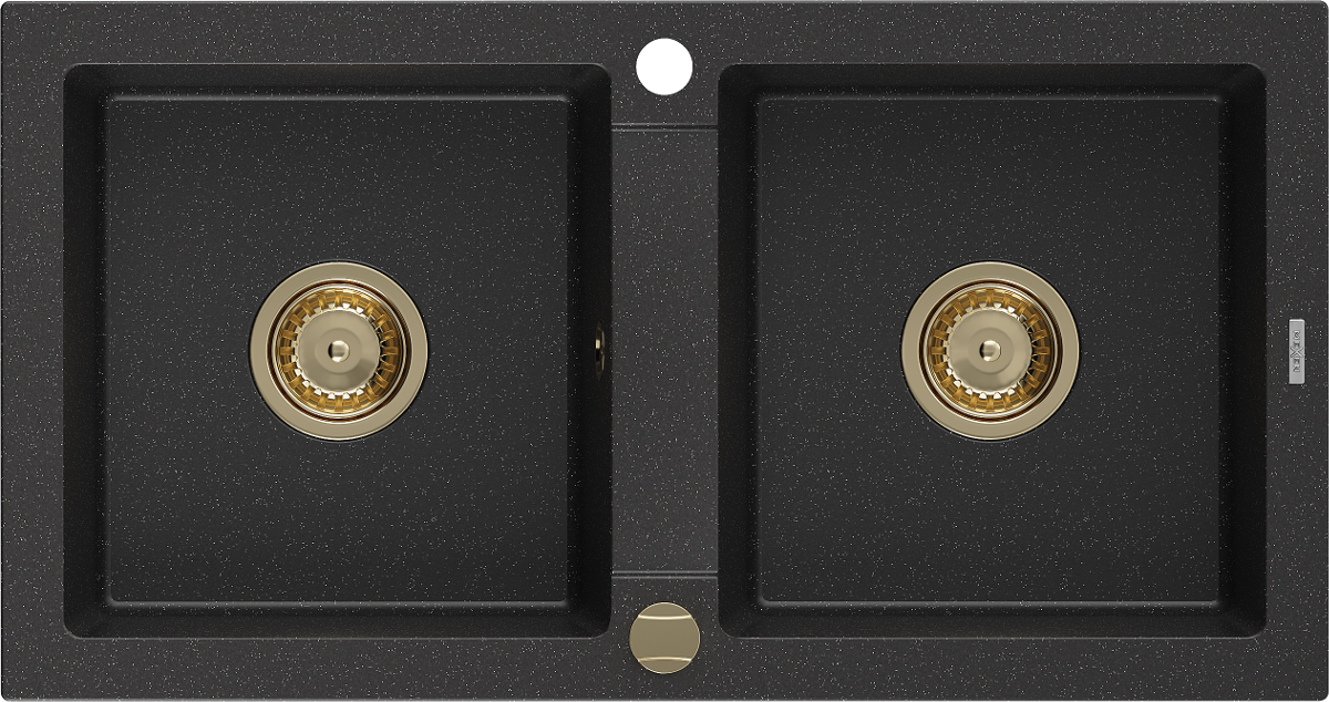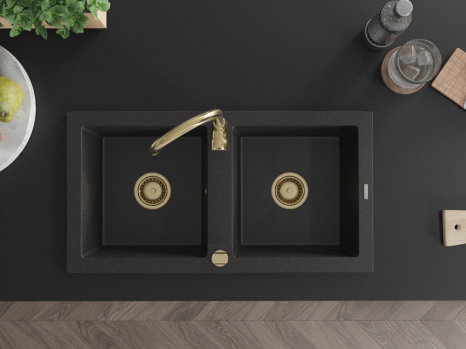 Mexen Mario granitový dřez 2-komorový 820 x 436 mm, černý/stříbrný metalický, sifon zlatý - 6504822000-73-G