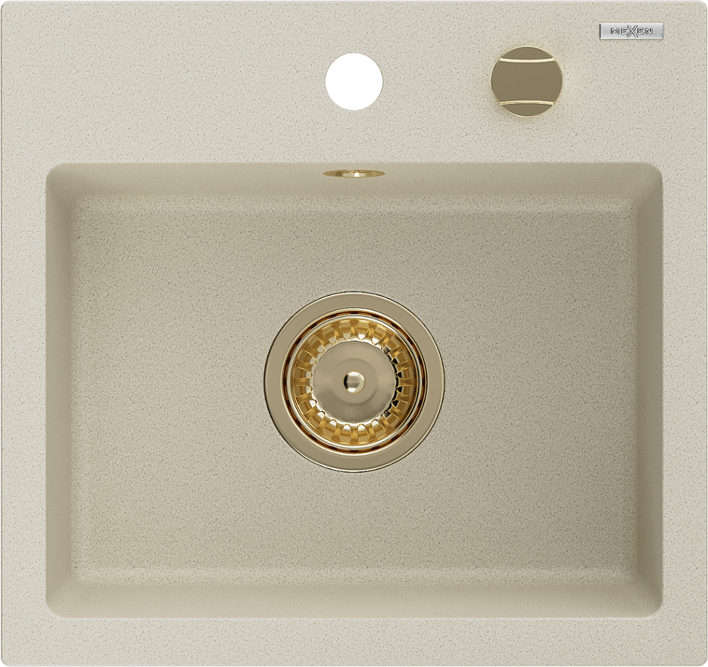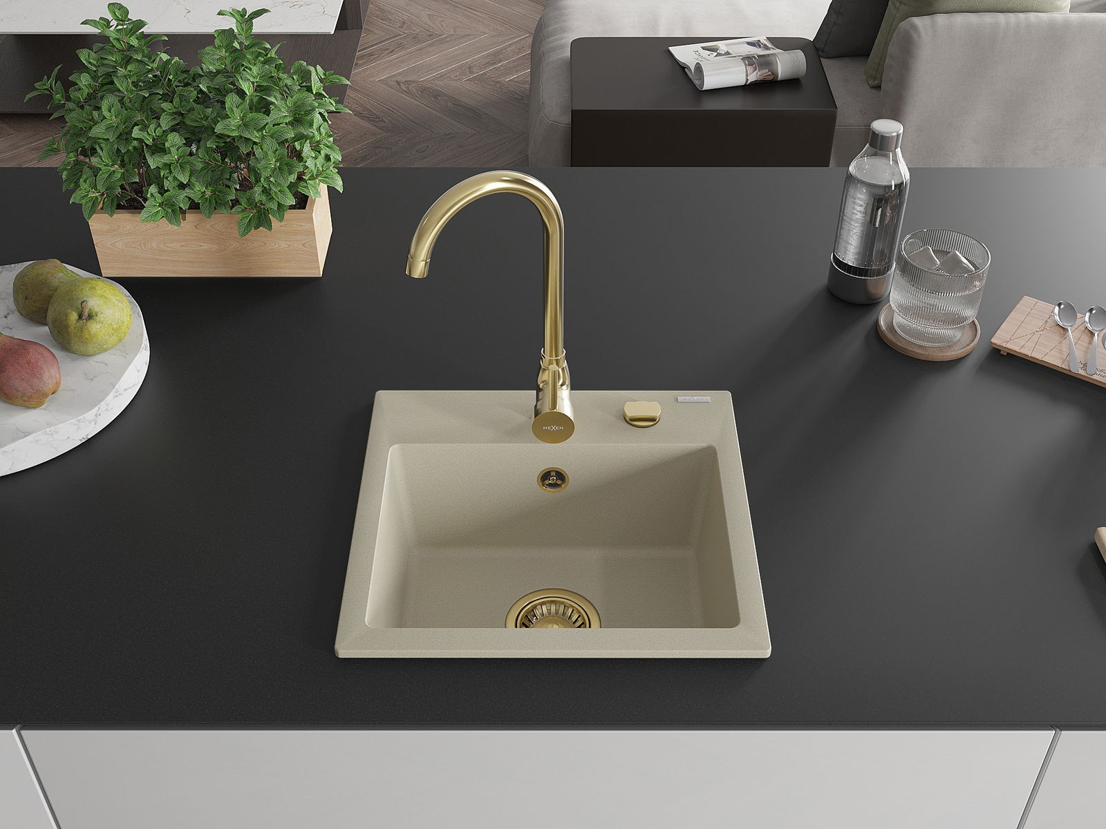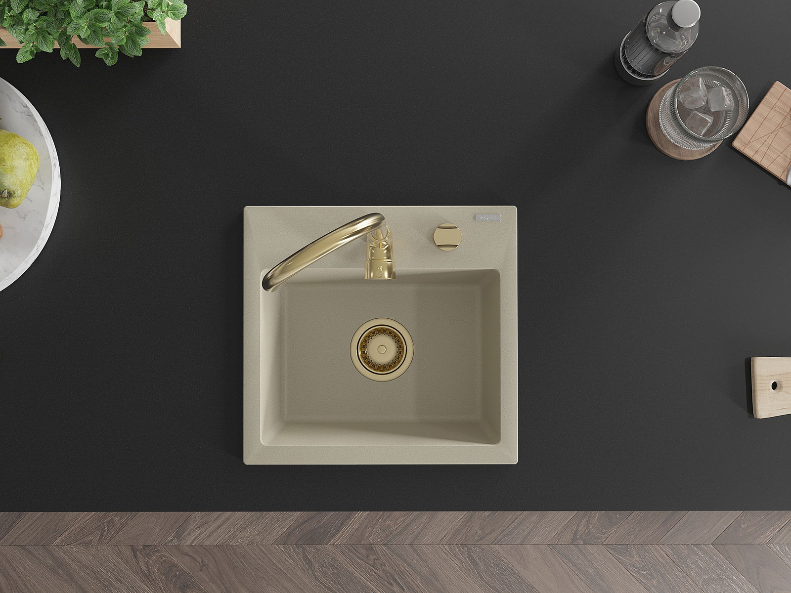 Mexen Milo jednokomorový granitový dřez 435 x 410 mm, béžový, zlatý sifon - 6505441000-69-G