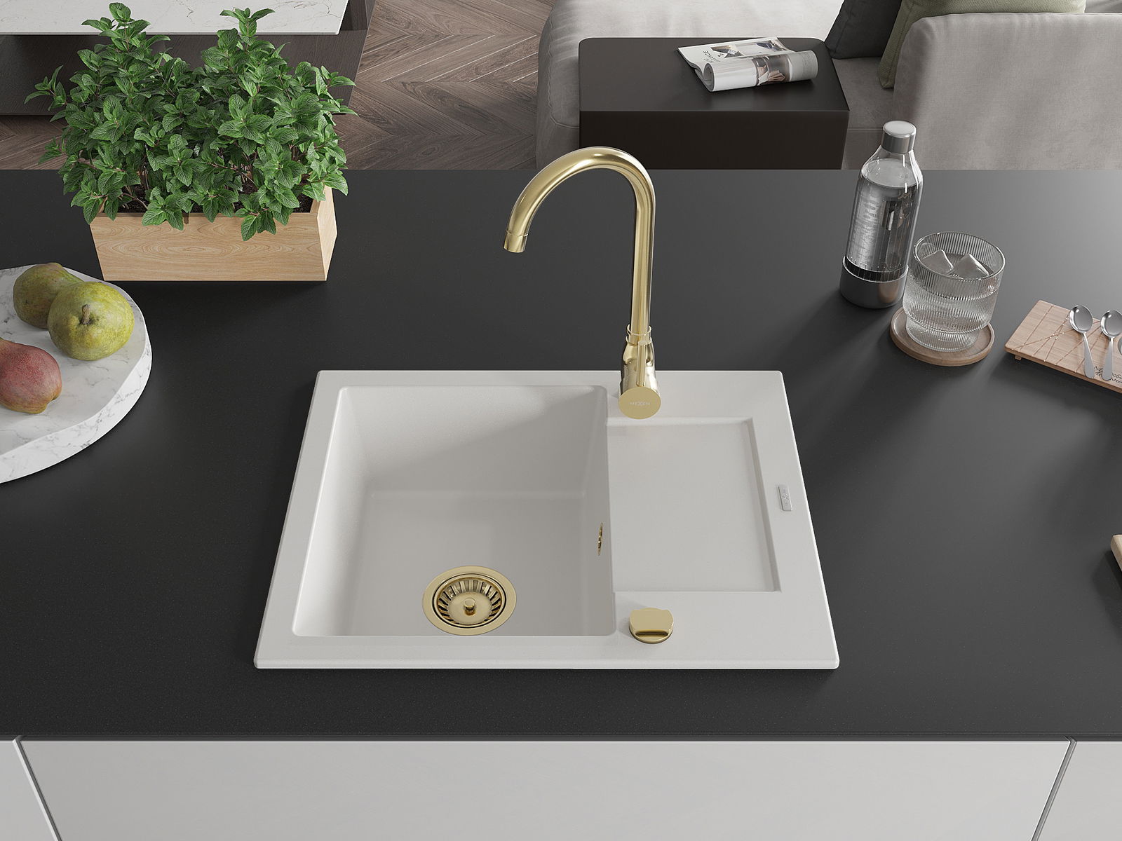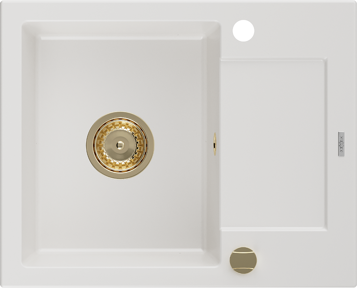 Mexen Enzo granitový dřez 1-komorový s odkapávačem 576 x 465 mm, bílý, zlatý sifon - 6506571005-20-G