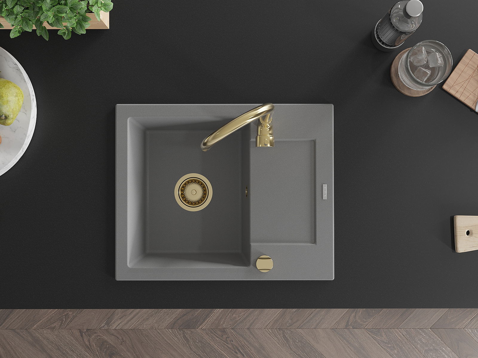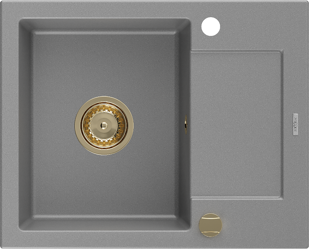 Mexen Enzo granitový dřez 1-komorový s odkapávačem 576 x 465 mm, šedý, sifon zlatý - 6506571005-71-G