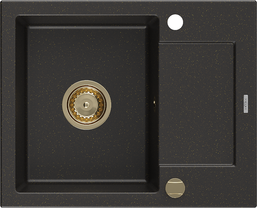 Mexen Enzo granitový dřez 1-komorový s odkapávačem 576 x 465 mm, černý/zlatý metalik, sifon zlatý - 6506571005-75-G