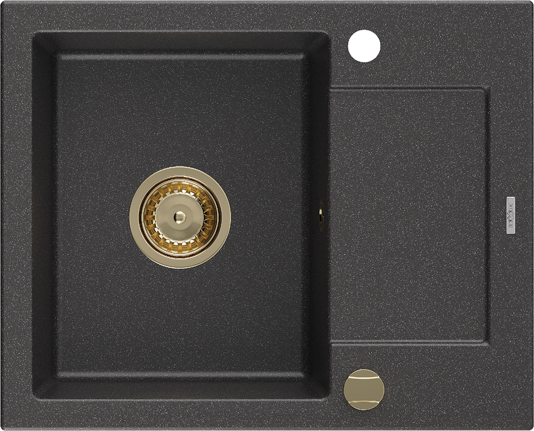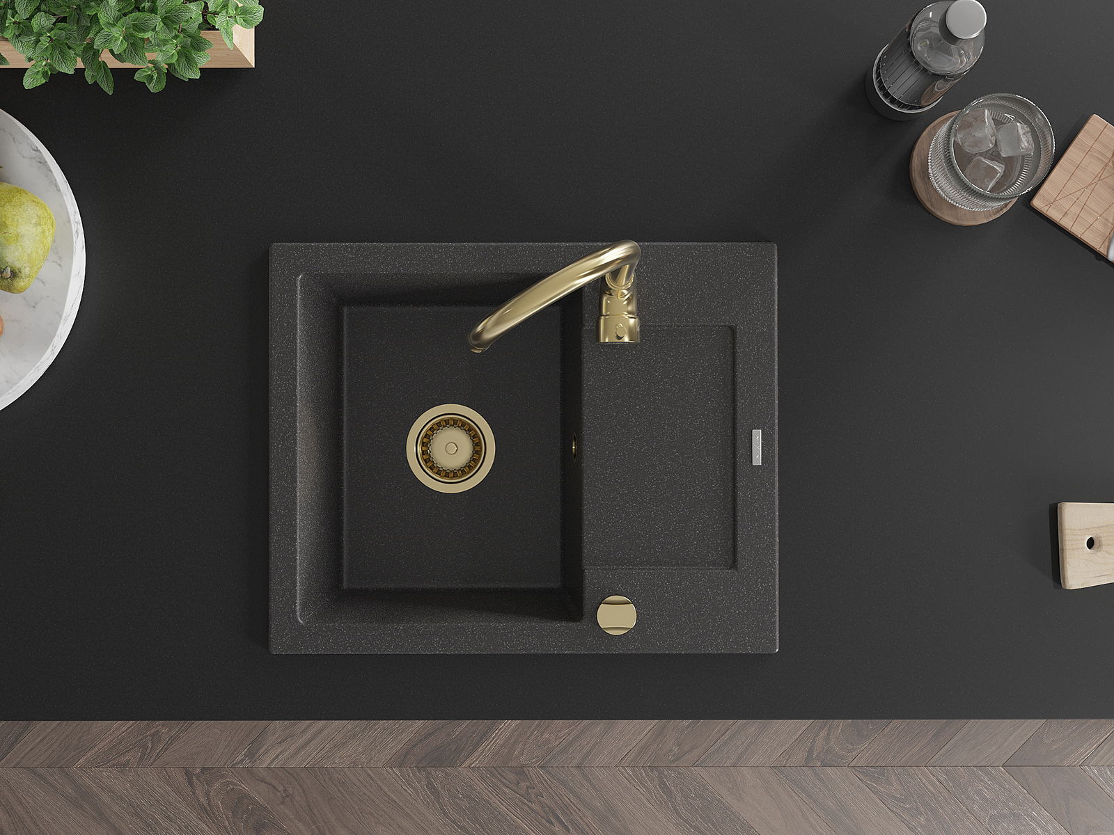 Mexen Enzo granitový dřez 1-komorový s odkapávačem 576 x 465 mm, černý kropenatý, sifon zlatý - 6506571005-76-G