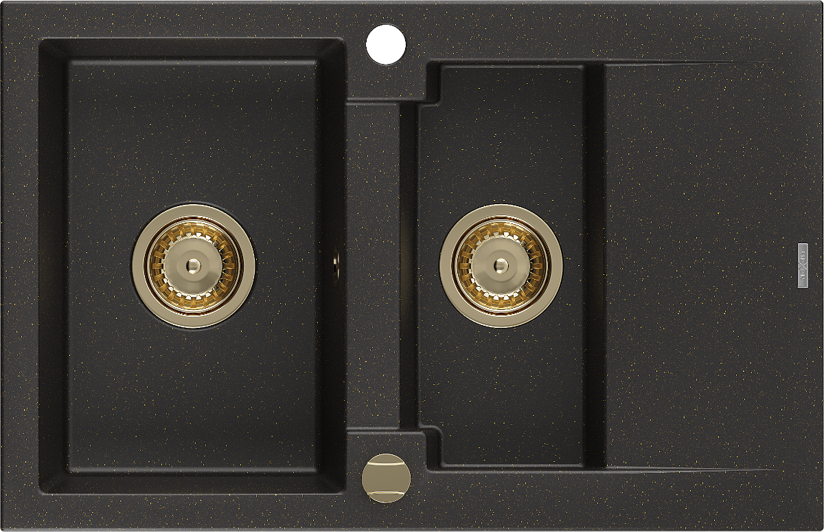 Mexen Gaspar žulový dřez 1,5-komorový s odkapávačem 737 x 475 mm, černý/zlatý metalic, zlatý sifon - 6507731505-75-G