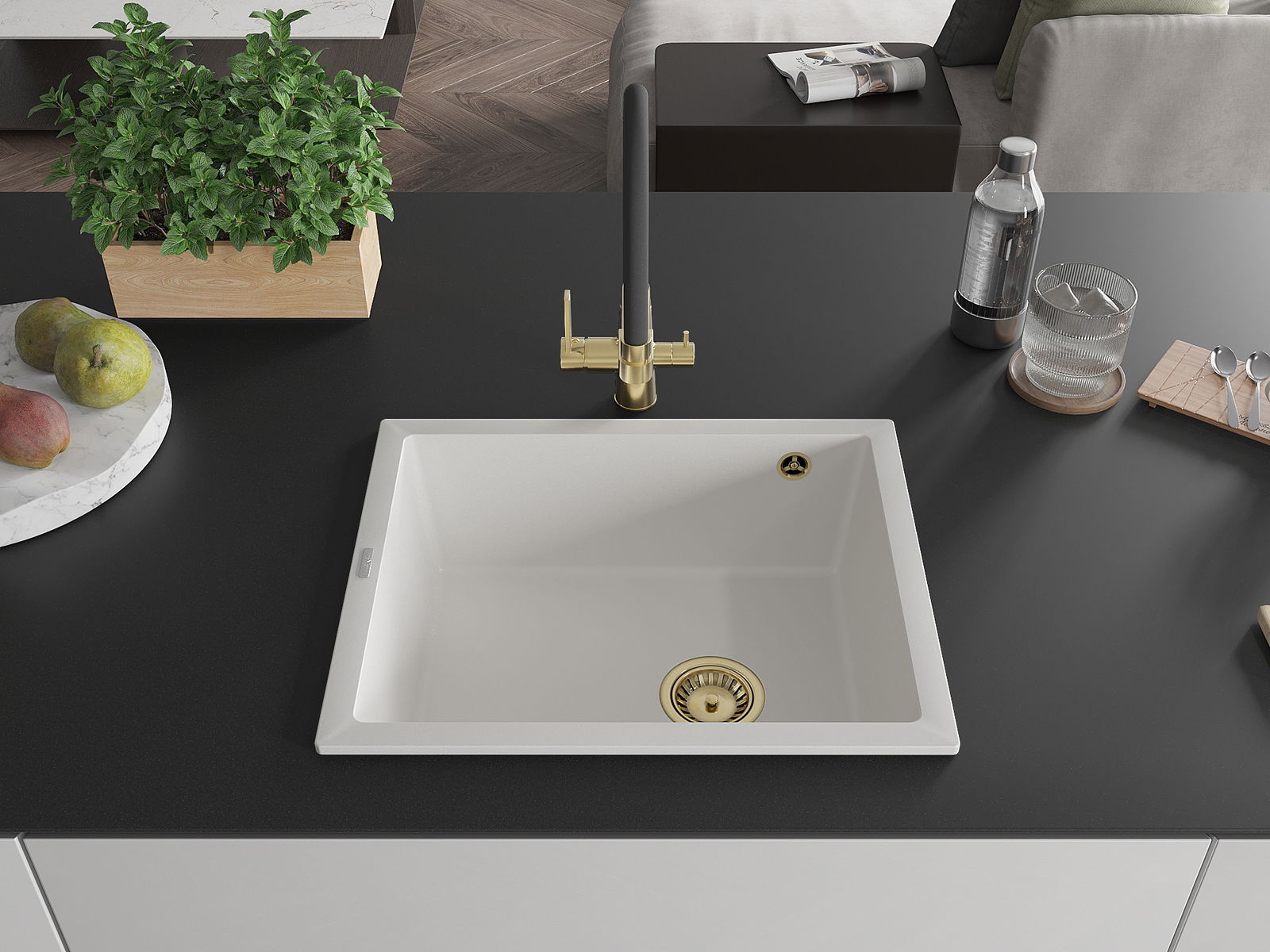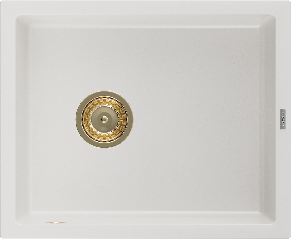 Mexen Pedro granitový dřez 1-komorový 560 x 460 mm, bílý, zlatý sifon - 6508561000-20-G