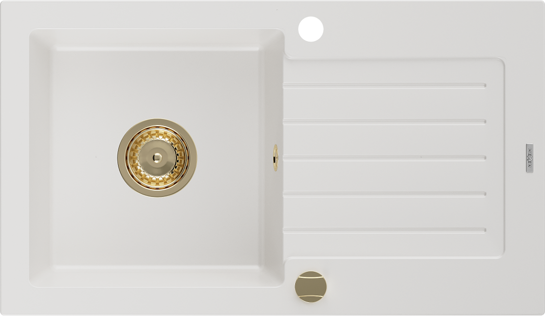 Mexen Pablo žulový dřez s jednou komorou a odkapávačem 752 x 436 mm, bílý, sifon zlatý - 6510751010-20-G