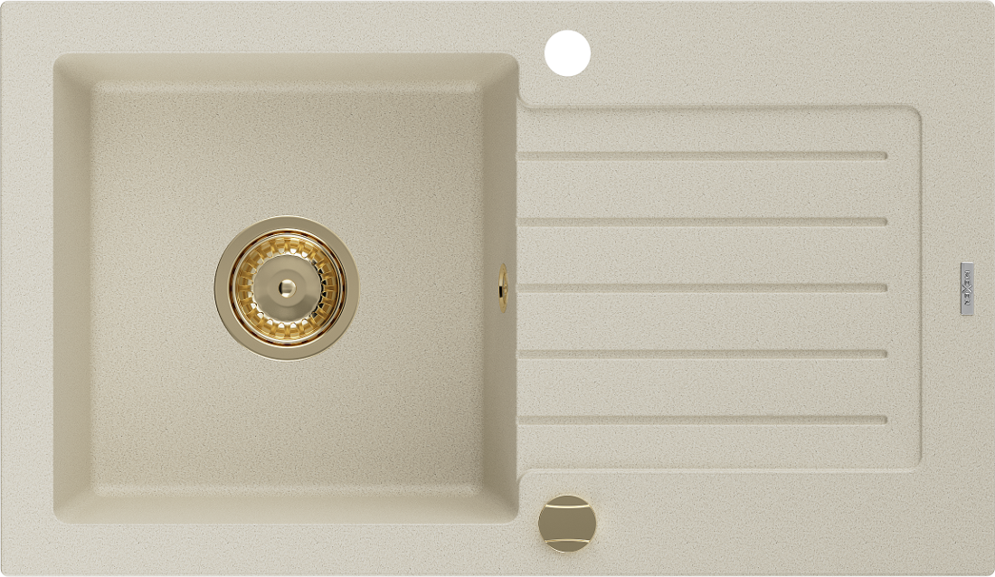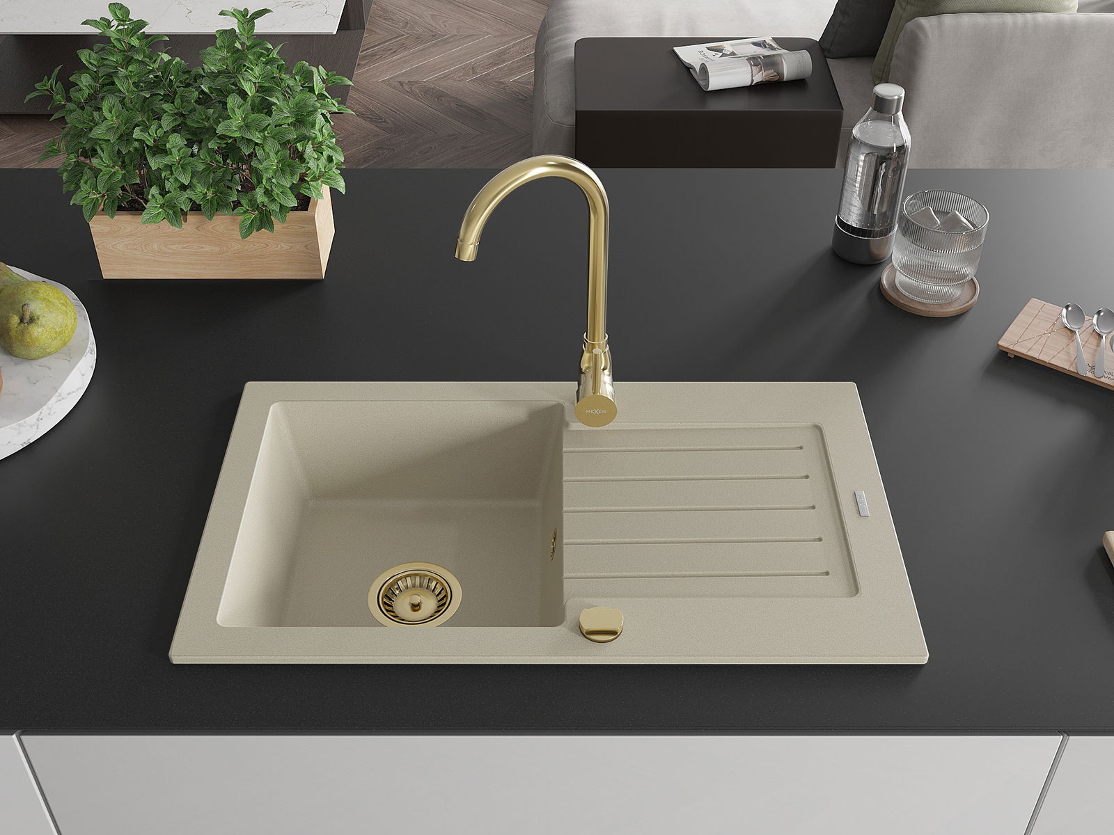 Mexen Pablo granitový dřez s 1 komorou a odkapávačem 752 x 436 mm, béžový, zlatý sifon - 6510751010-69-G
