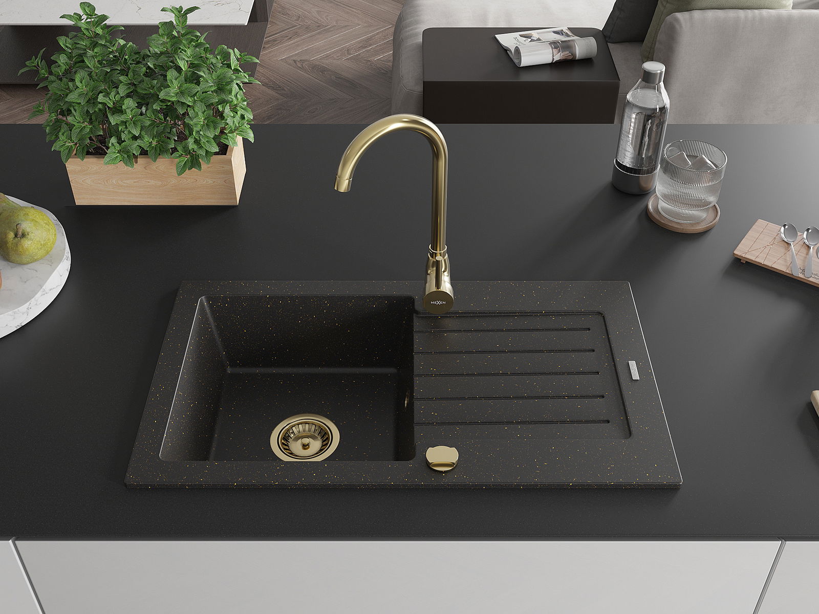 Mexen Pablo žulový dřez s odkapávačem, 1-komorový, 752 x 436 mm, černý/zlatý metalik, zlatý sifon - 6510751010-75-G