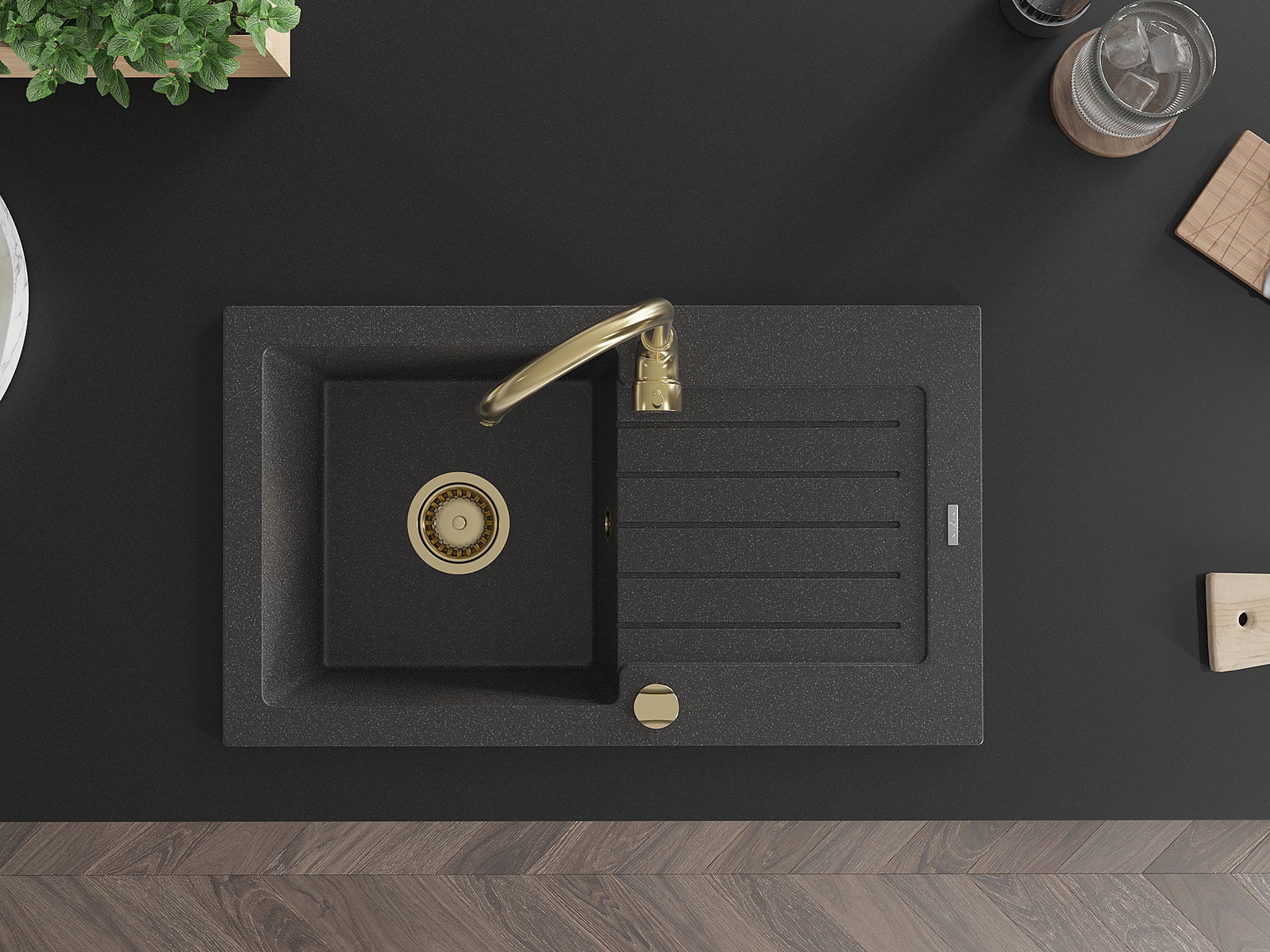 Mexen Pablo žulový dřez s odkapávačem, 1-komorový, 752 x 436 mm, černý s tečkami, zlatý sifon - 6510751010-76-G