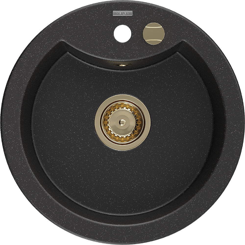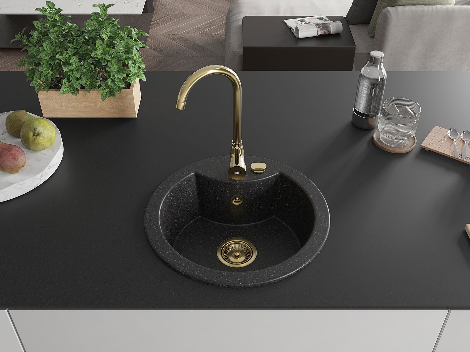 Mexen Diego jednorázový granitový dřez 488 x 480 mm, černá/stříbrná metalíza, zlatý sifon - 6512481000-73-G