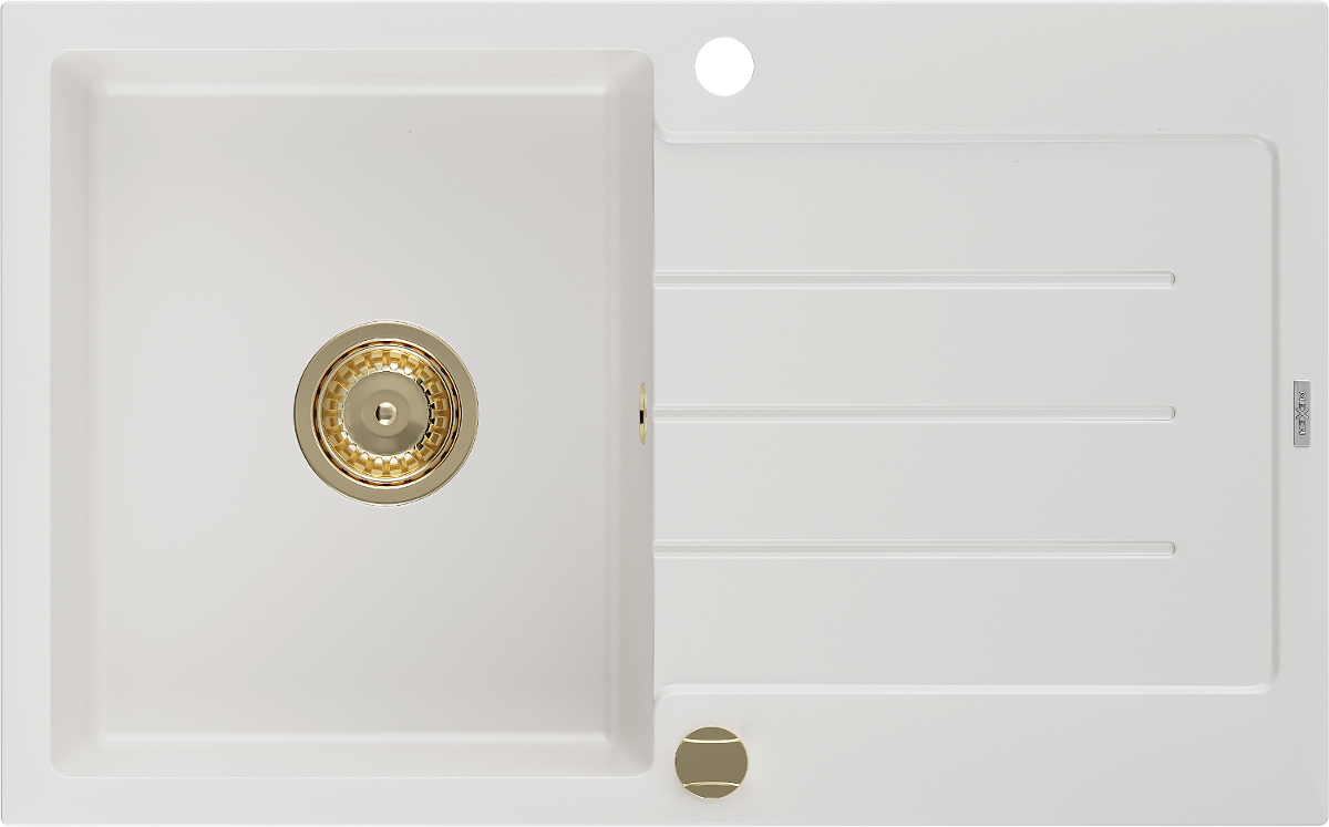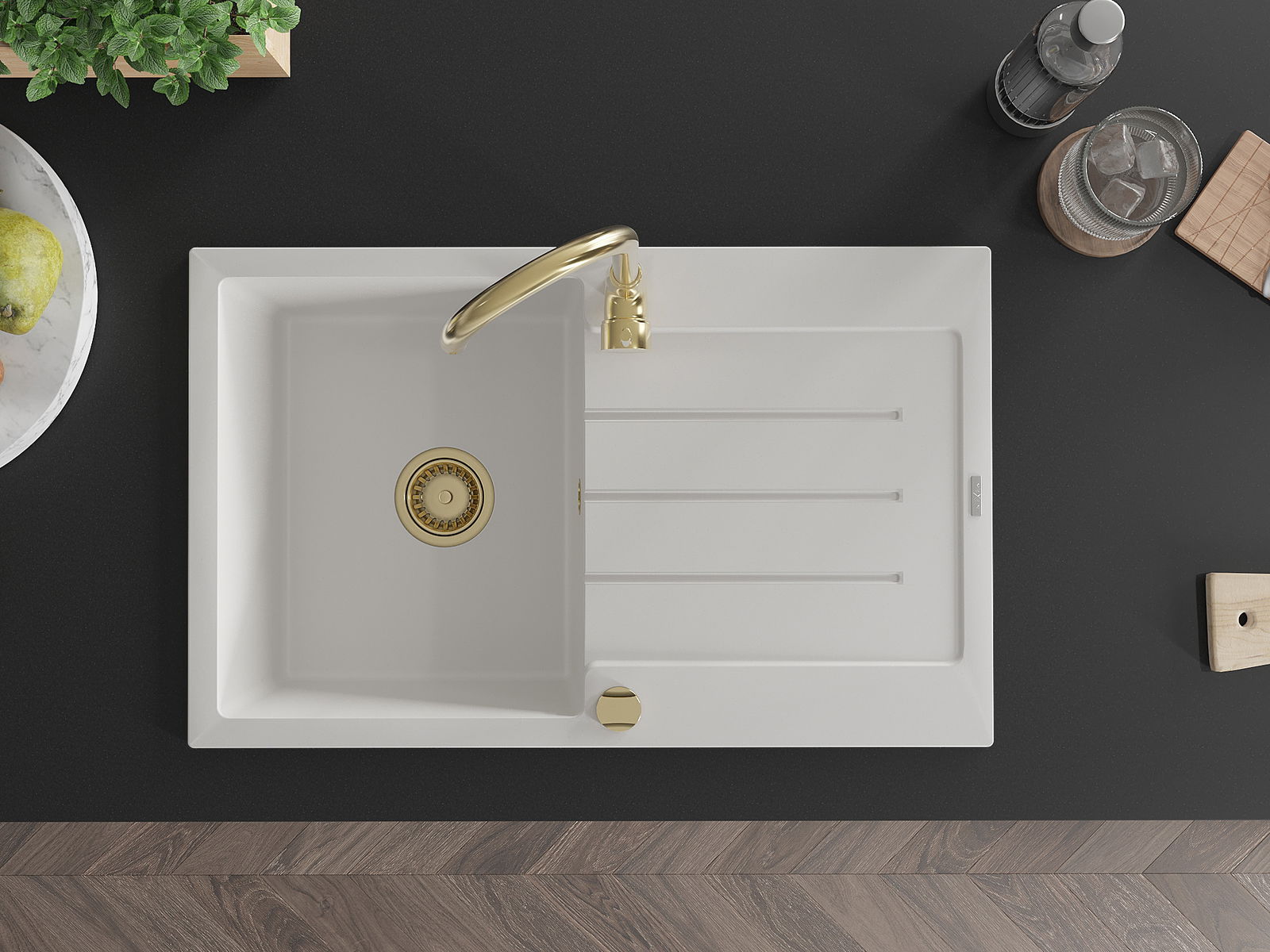 Mexen Bruno granitový dřez 1-komorový s odkapávačem 795 x 495 mm, bílý, zlatý sifon - 6513791010-20-G