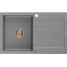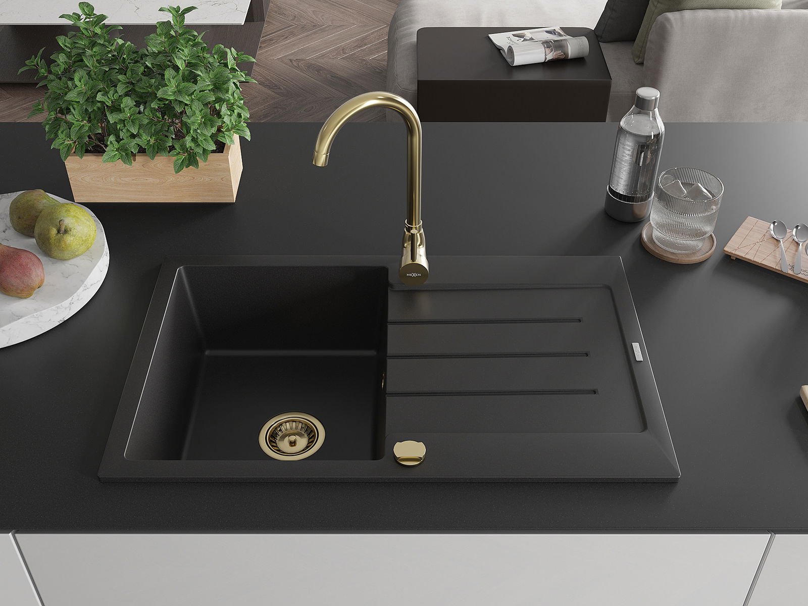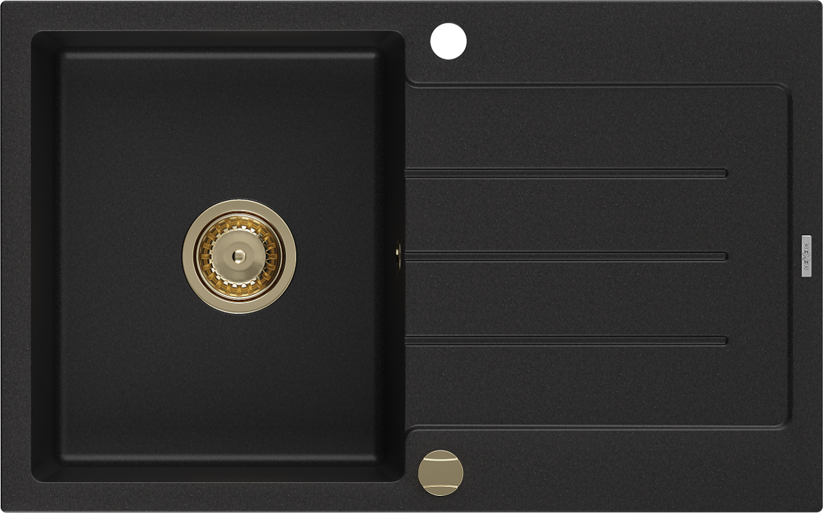 Mexen Bruno granitový dřez 1-komorový s odkapávačem 795 x 495 mm, černý, sifon zlatý - 6513791010-77-G