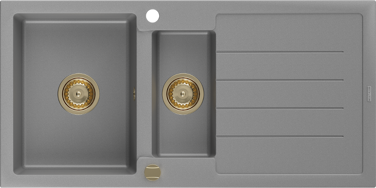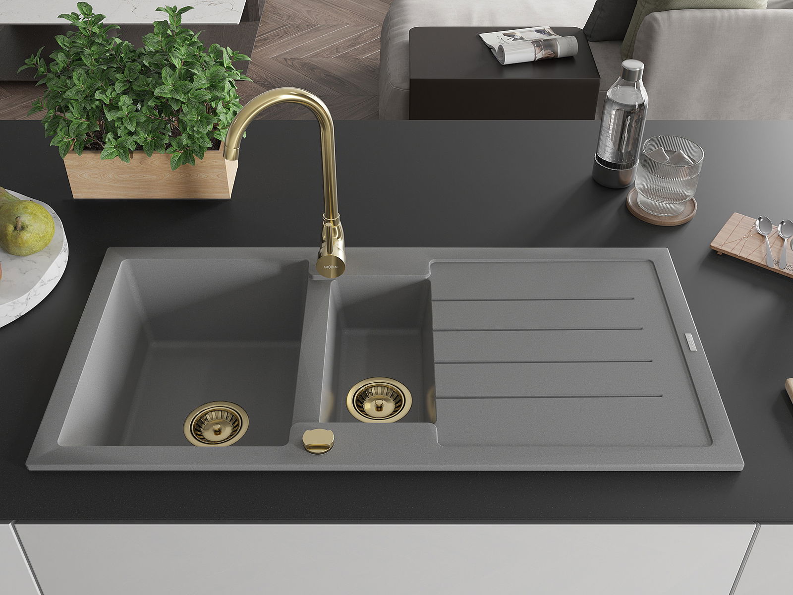 Mexen Andres granitový dřez 1,5-komorový s odkapávačem 1000 x 500 mm, šedý, zlatý sifon - 6515101510-71-G