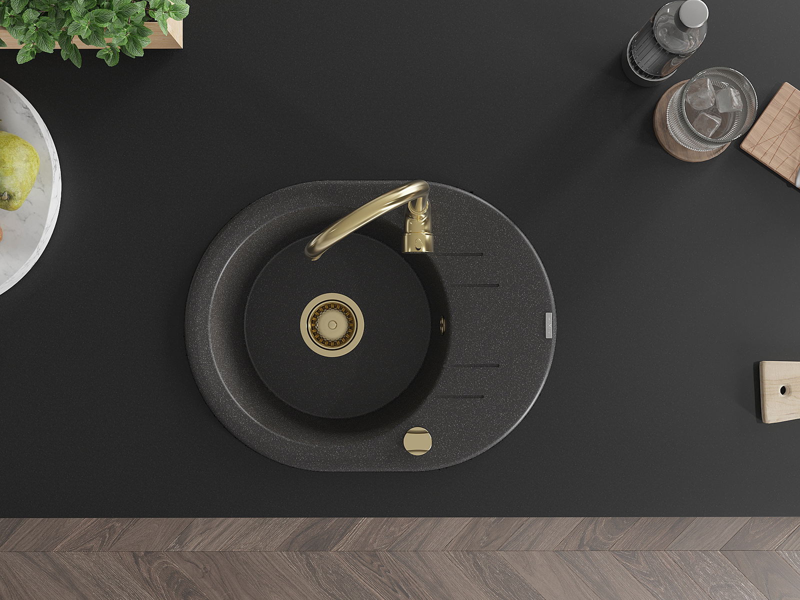 Mexen Kevin granitový dřez s 1 komorou a odkapávačem 586 x 458 mm, černý kropenatý, zlatý sifon - 6517581005-76-G
