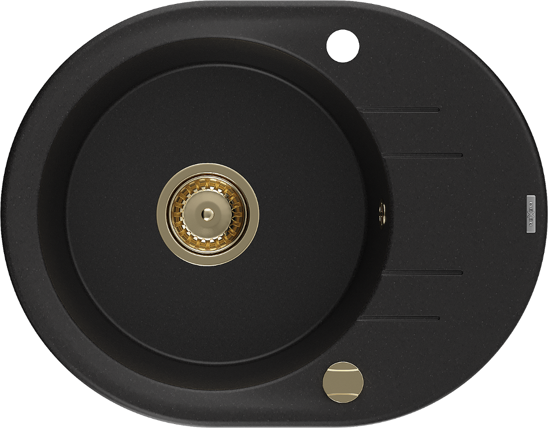 Mexen Kevin granitový dřez 1-komorový s odkapávačem 586 x 458 mm, černý, zlatý sifon - 6517581005-77-G